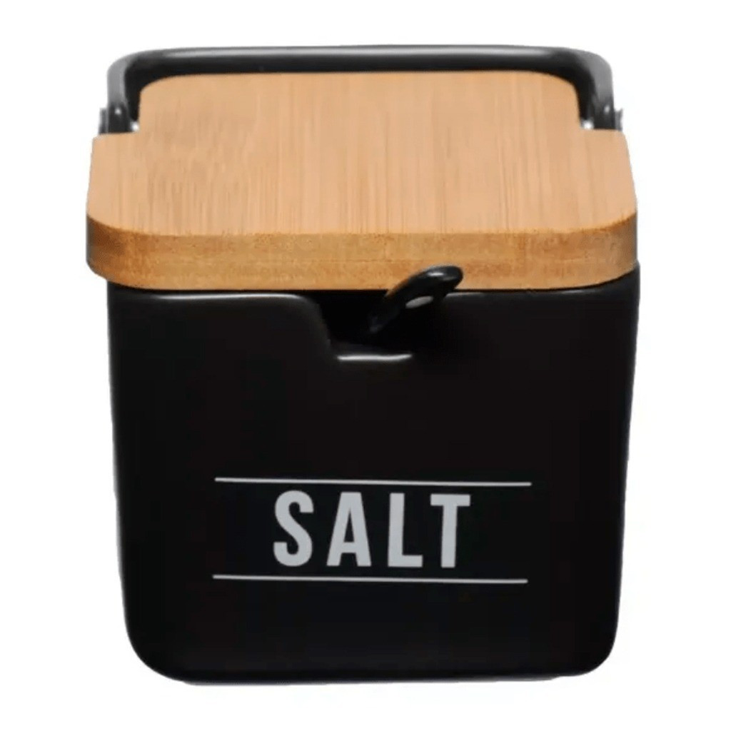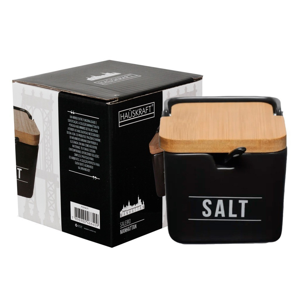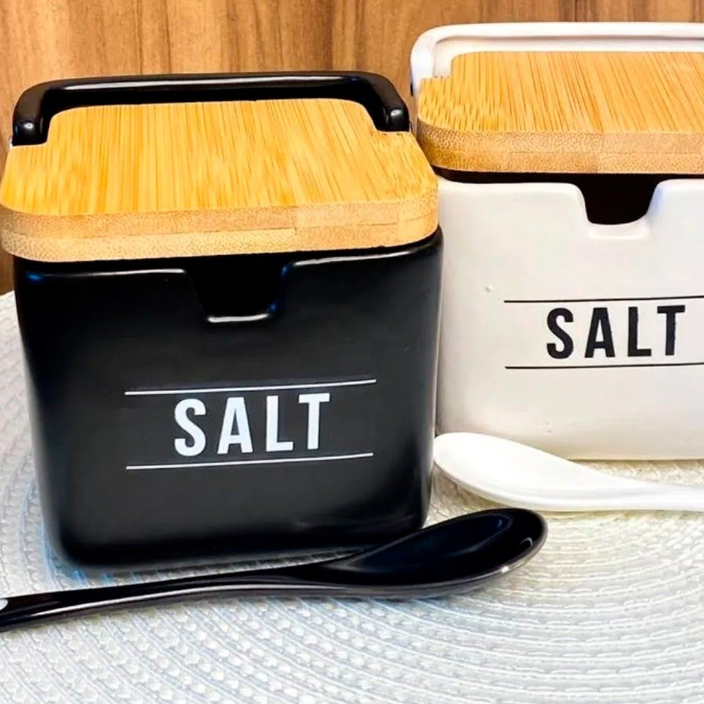 Porta Sal Saleiro De Porcelana Com Colher + Tampa De Madeira Hauskraft