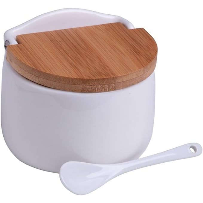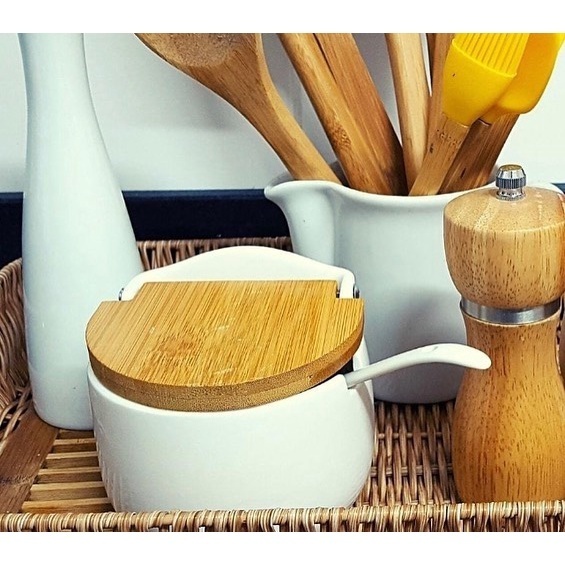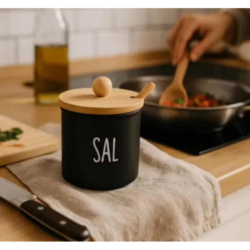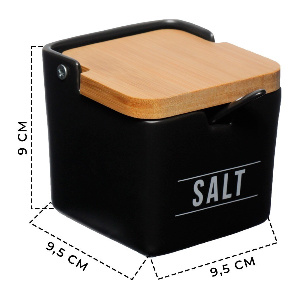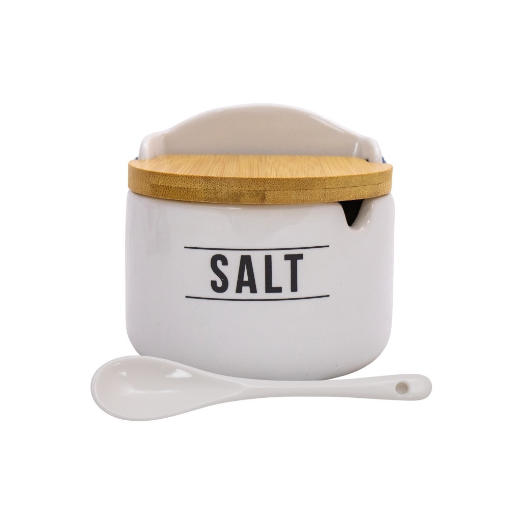 Porta Sal Saleiro De Porcelana Com Colher + Tampa De Madeira Hauskraft