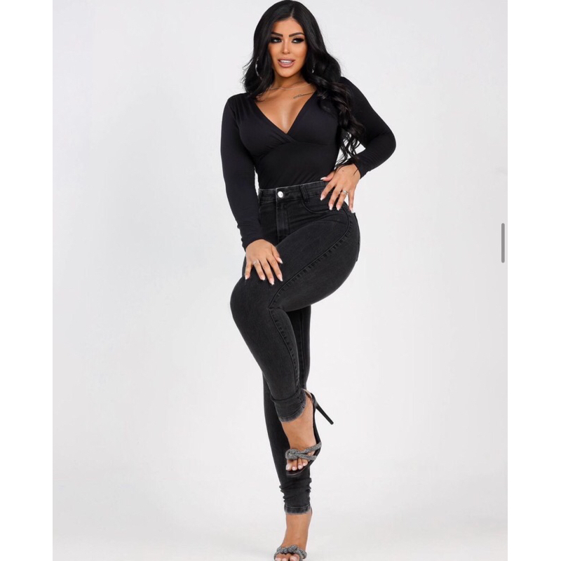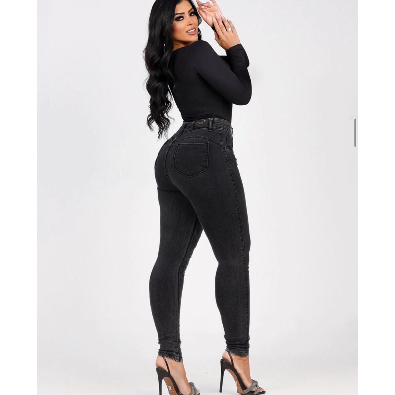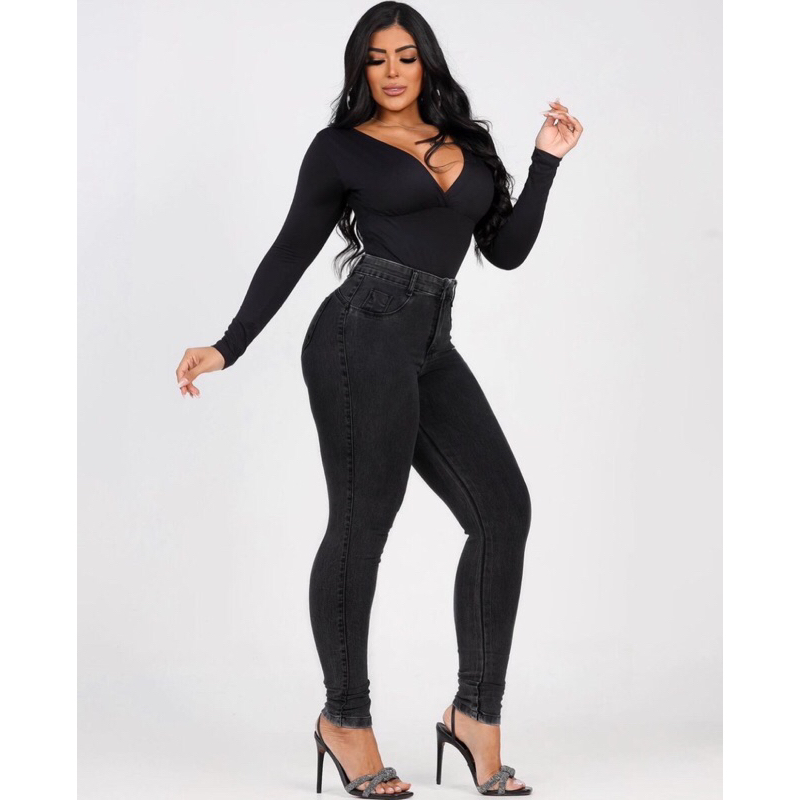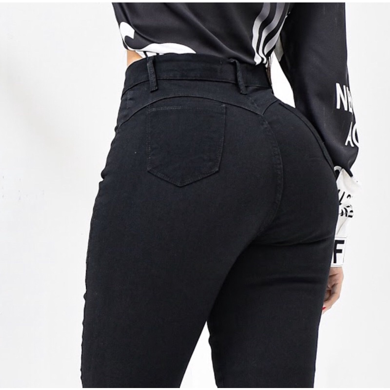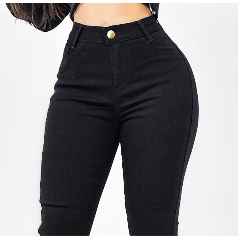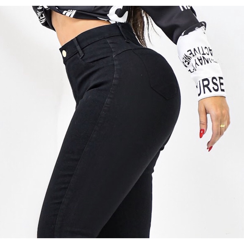 calça preta jeans skinny com lycra cintura alta modelagem levanta bumbum moda feminina