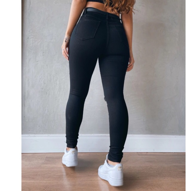 Calça Jeans Feminina Rasgada no Joelho Preta Skinny