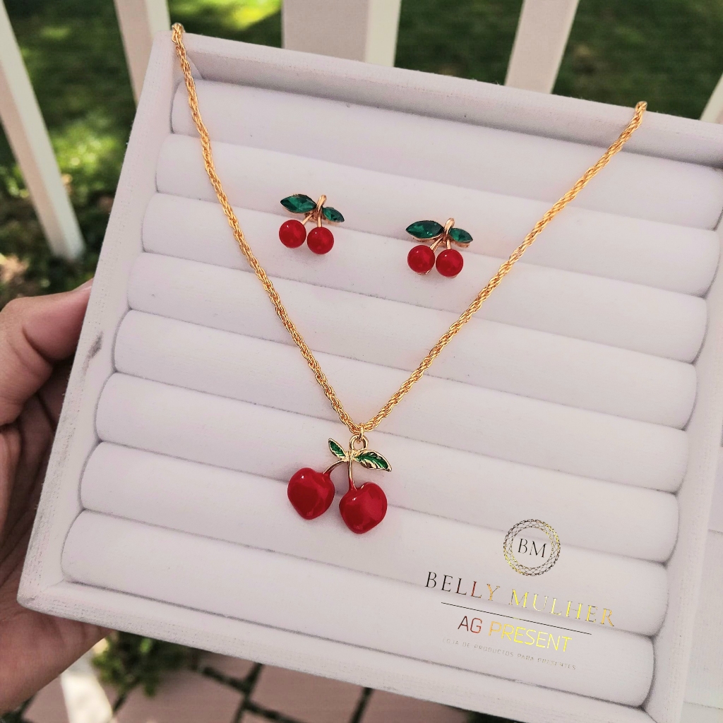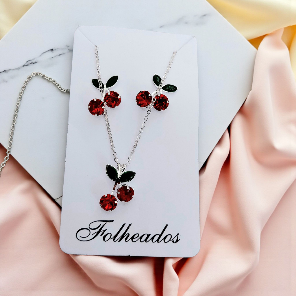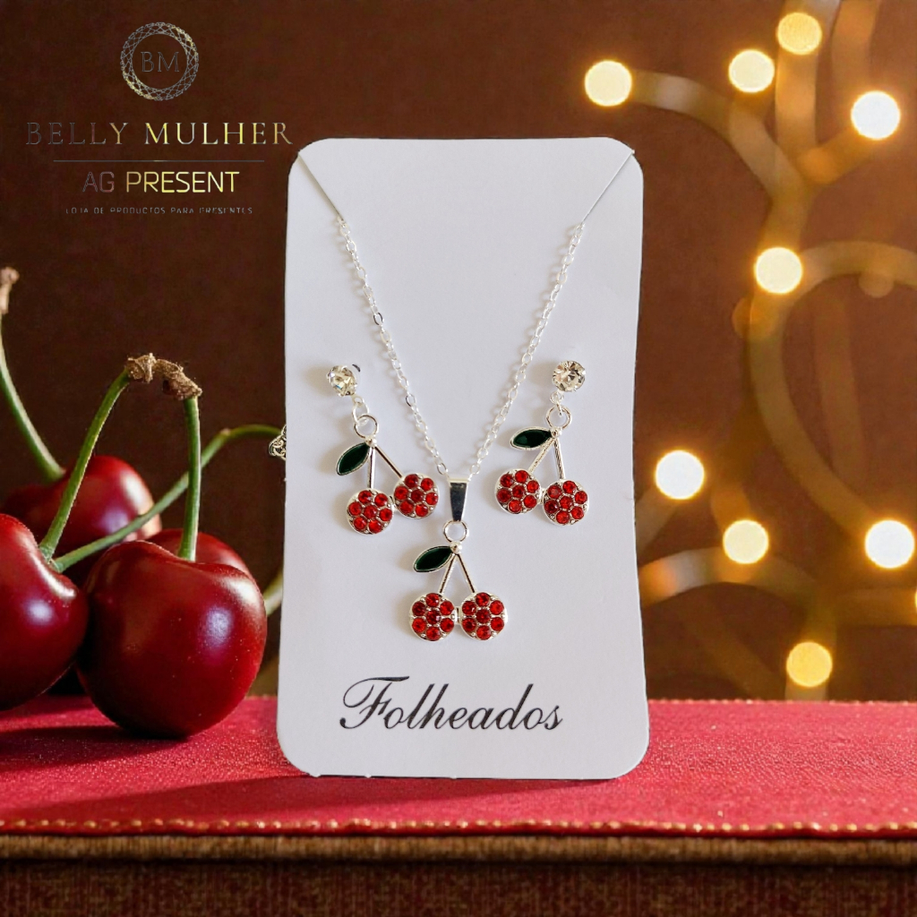 Conjunto Colar e Brinco Cereja Feminino - Cherry Folheado a Prata 925 e Ouro 18K