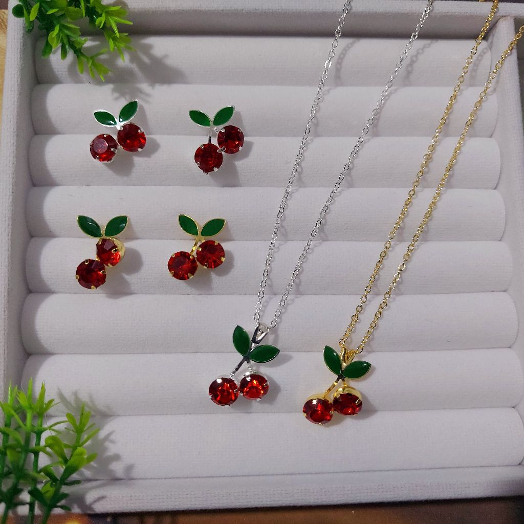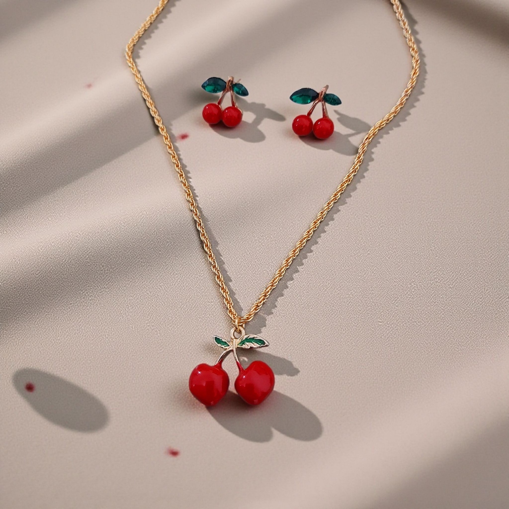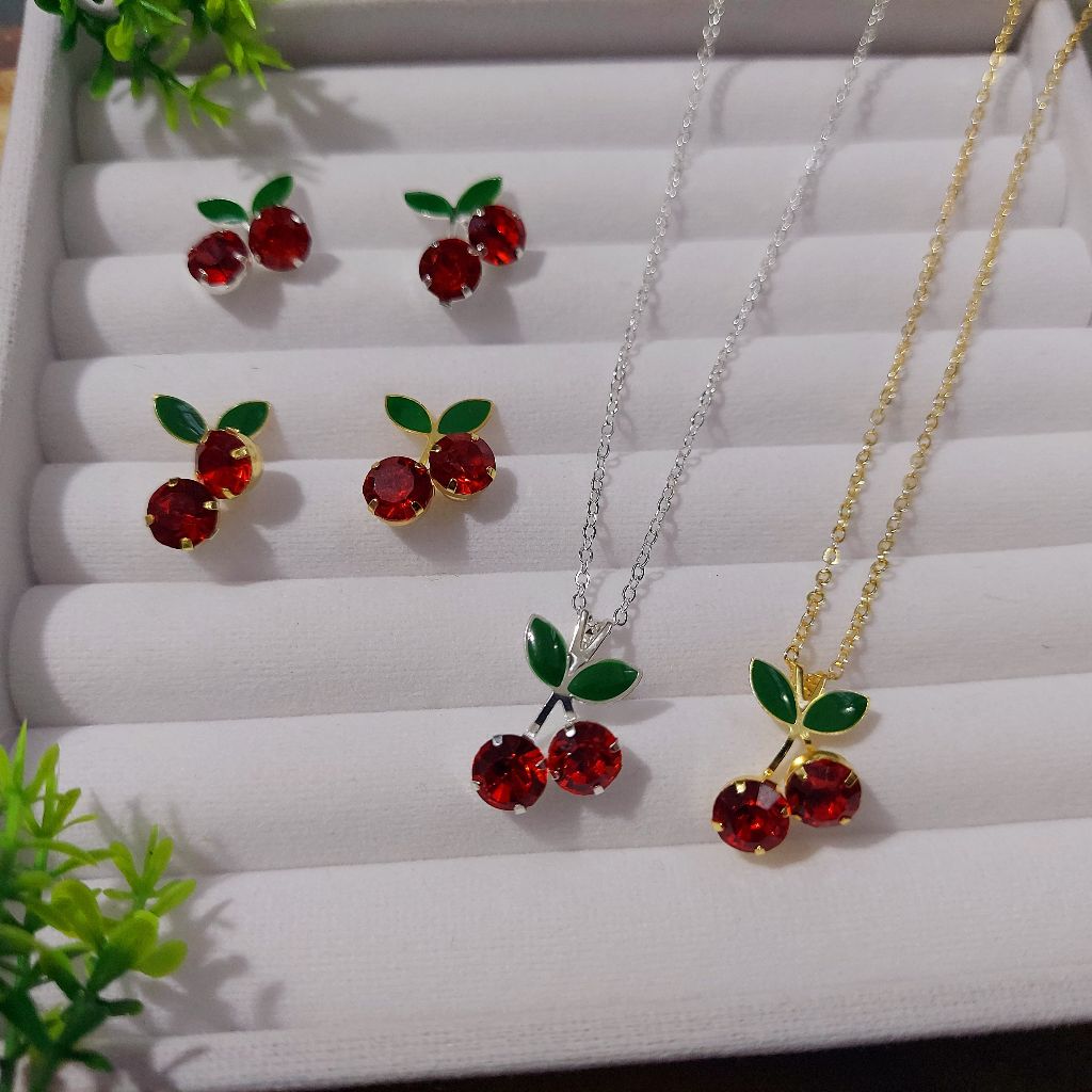 Conjunto Colar e Brinco Cereja Feminino - Cherry Folheado a Prata 925 e Ouro 18K