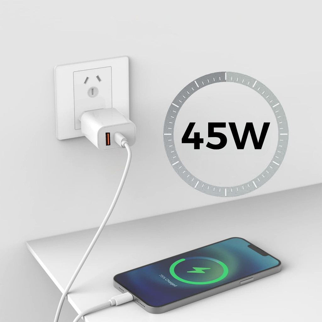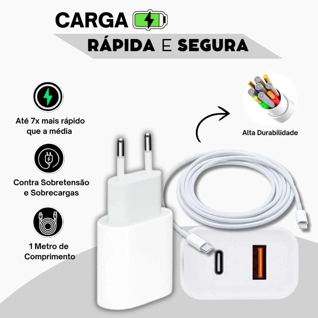 Kit Carregador iPhone Turbo 45W 2 Entradas USB e USB-C + Cabo Ultra Rápido 6 7 8 X XR XS 11 12 13 14