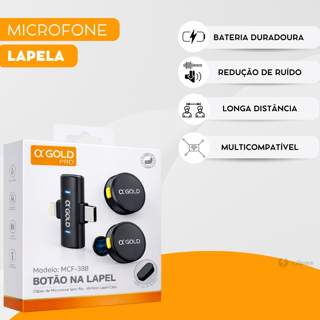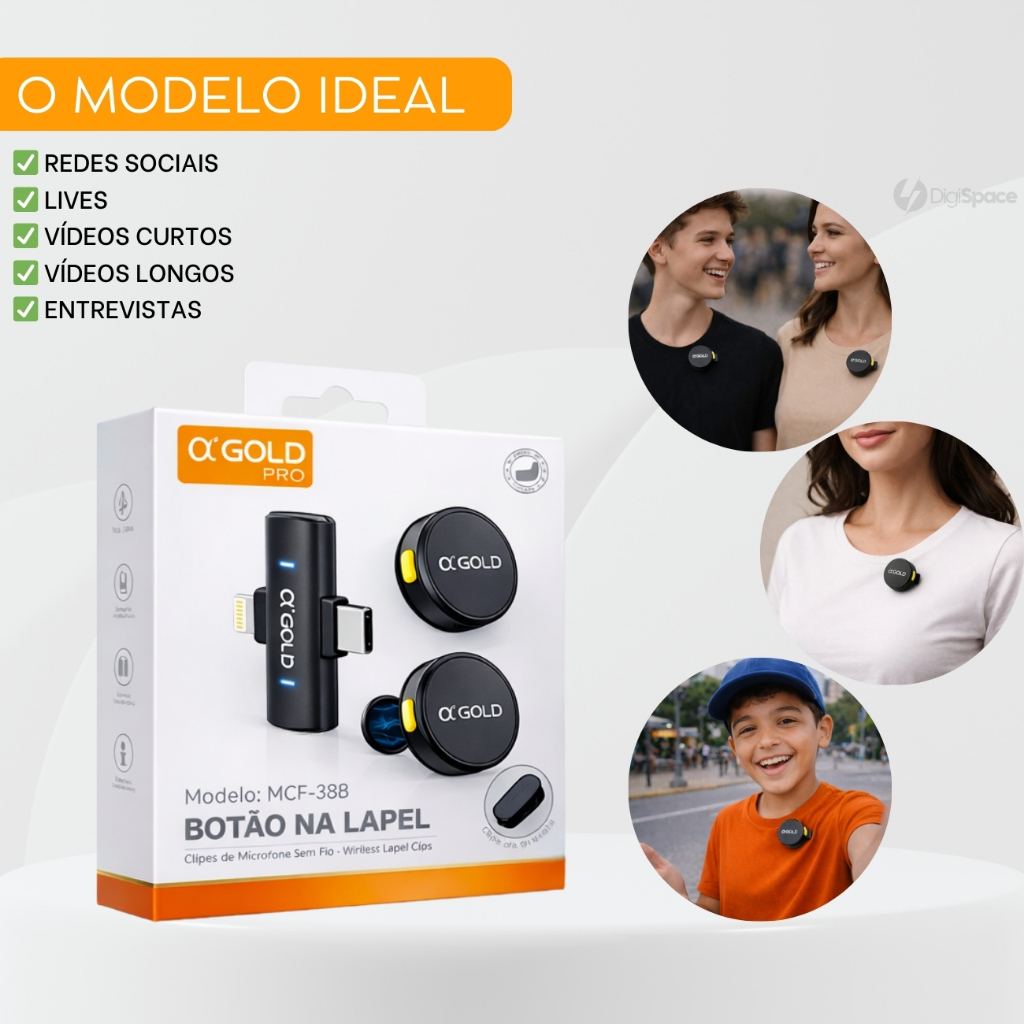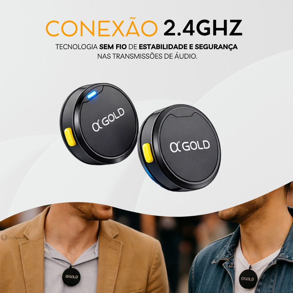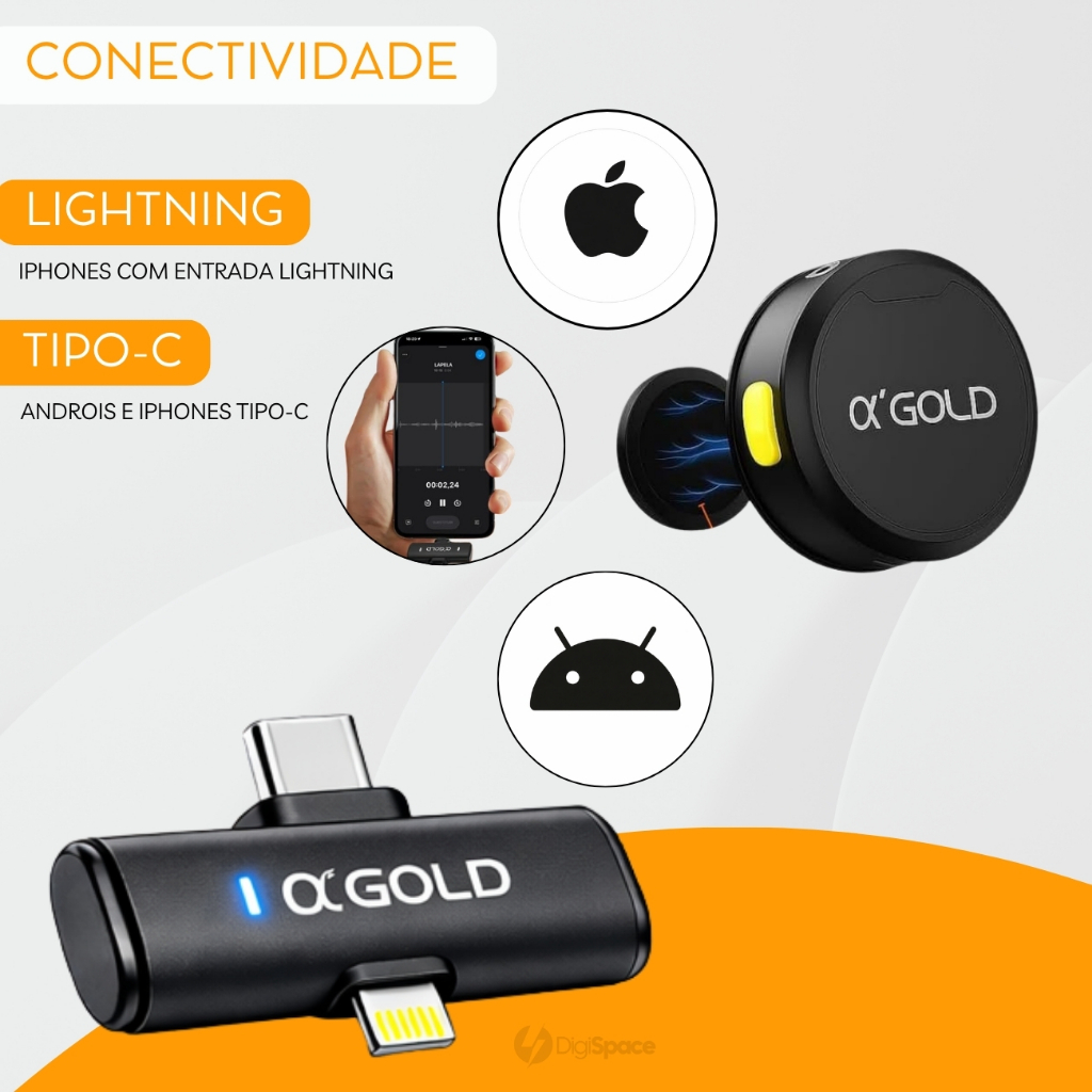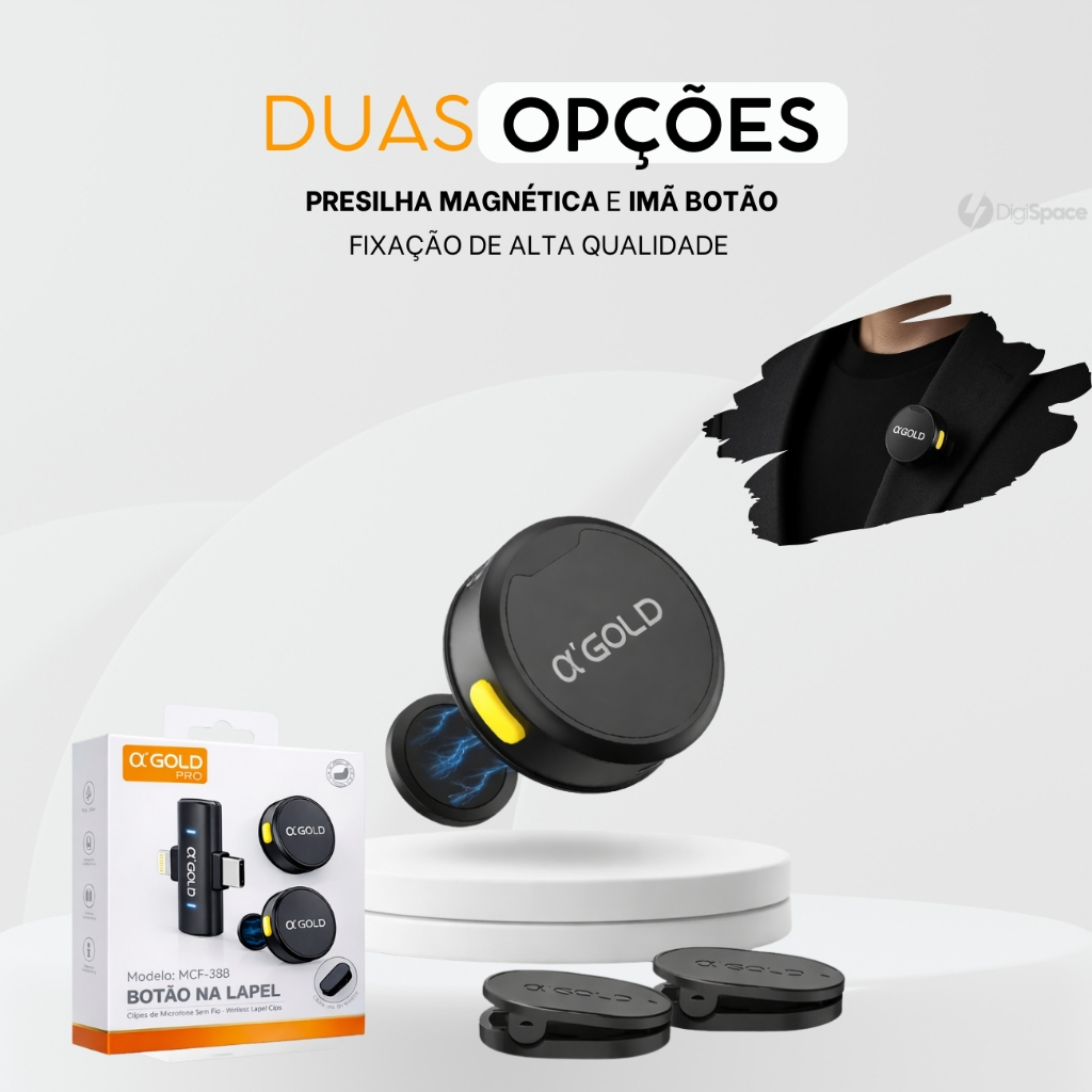 Microfone Sem fio de Lapela Duplo Magnético Redondo Bluetooth para Celular Entrevista 2 em 1 A'Gold