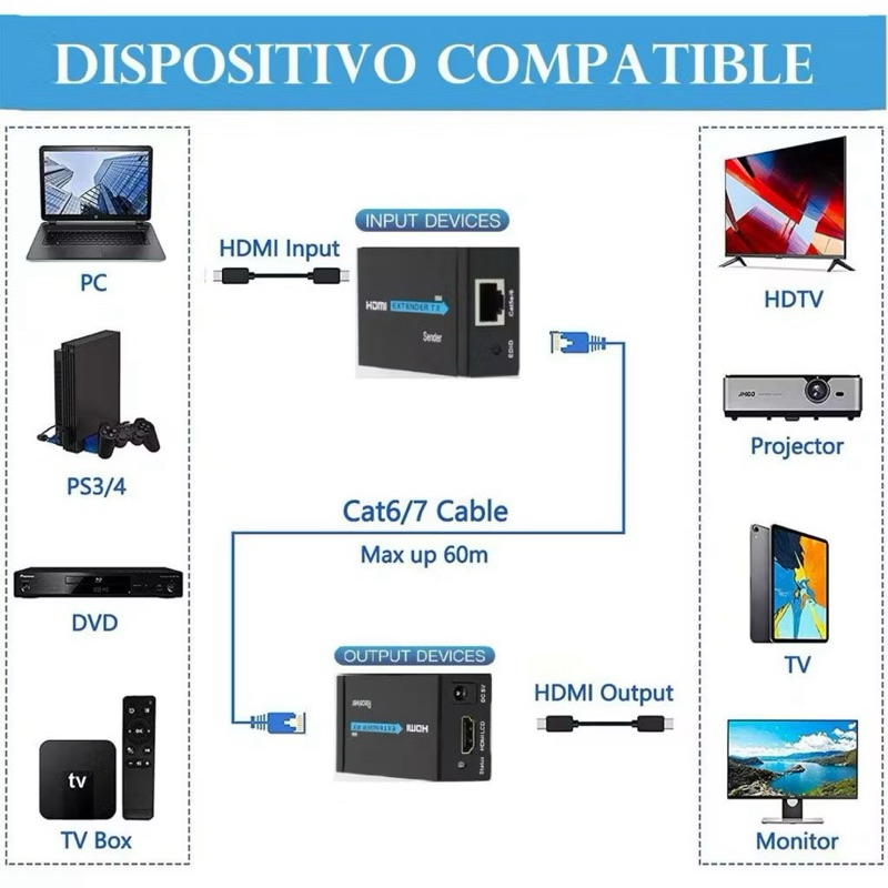 Extensor Compatível com HDMI Rj45 60m 60 Metros Adaptador Cabo Rede Cat 6 7