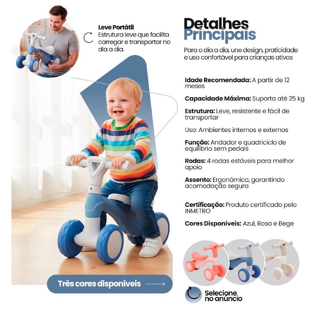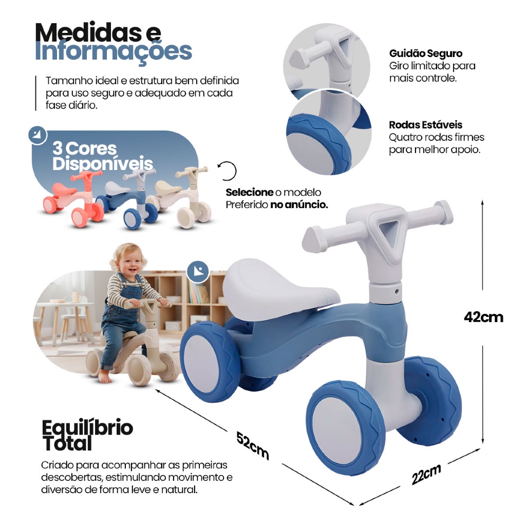 Bicicleta de Equilíbrio Infantil Sem Pedal Andador 4 Rodas Bebê Criança Zippy