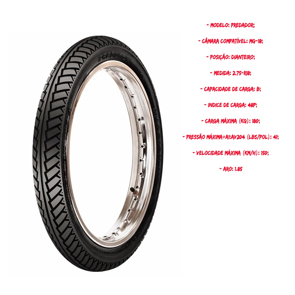 Pneu Maggion Predator ( 80-100-18 = ( 2.75-18 48P TL ) Dianteiro Titan FAN 125 / 150 / 160 / Factor Fazer 125 / 150 / YES 125