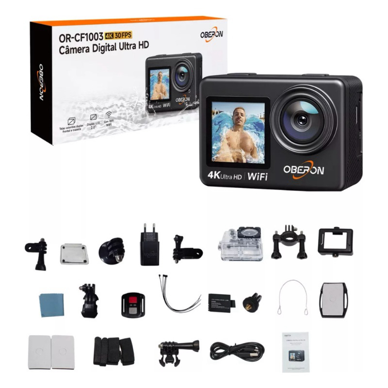 Câmera Esportiva 4K com Dupla Tela + Wi-Fi + 30m à Prova d’Água – Ultra HD com Controle Remoto e Acessórios