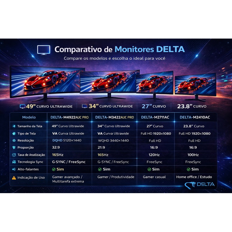Monitor Gamer DELTA Curvo com Alto-falantes | 23.8” 27” 34” 49” | Vários Modelos