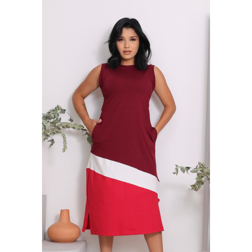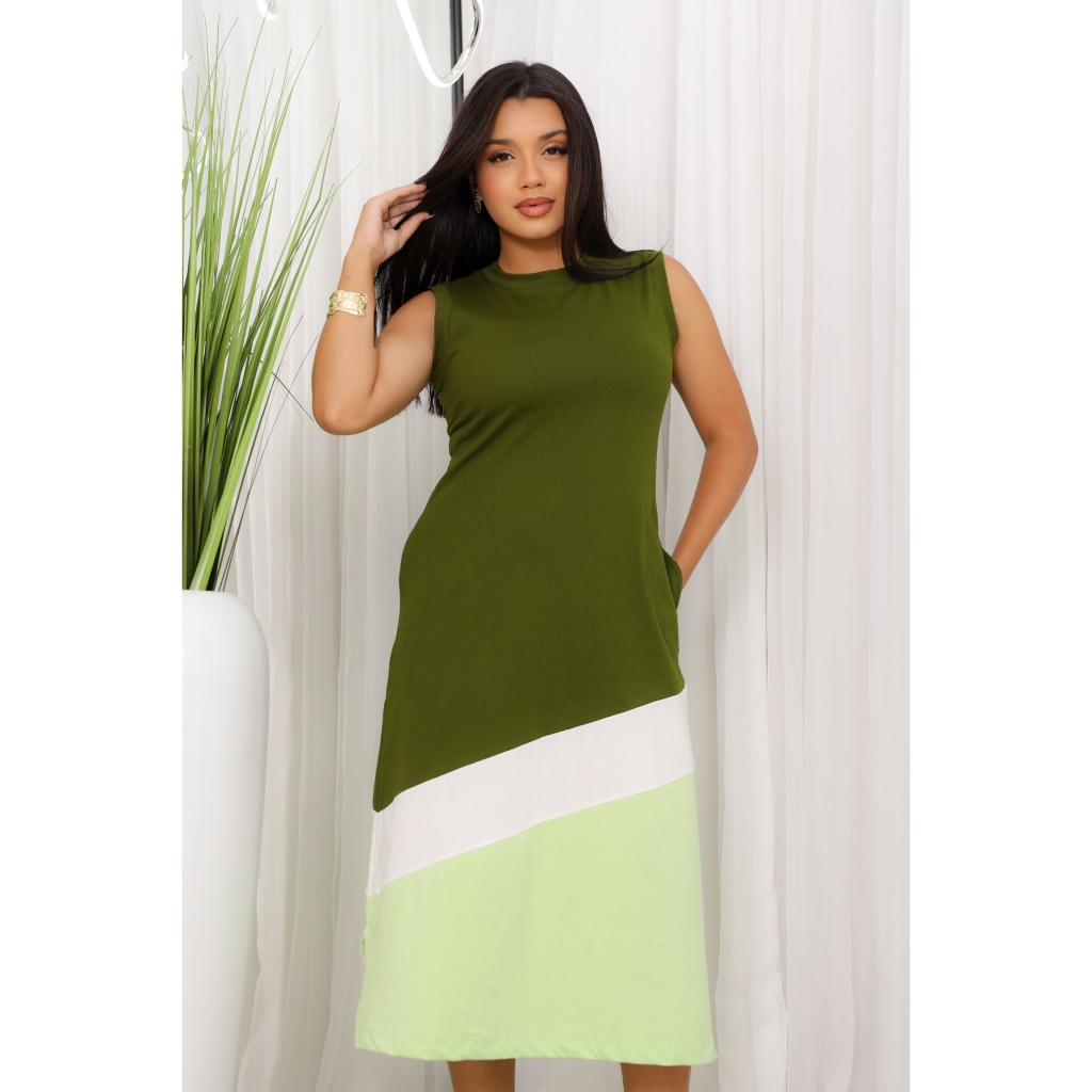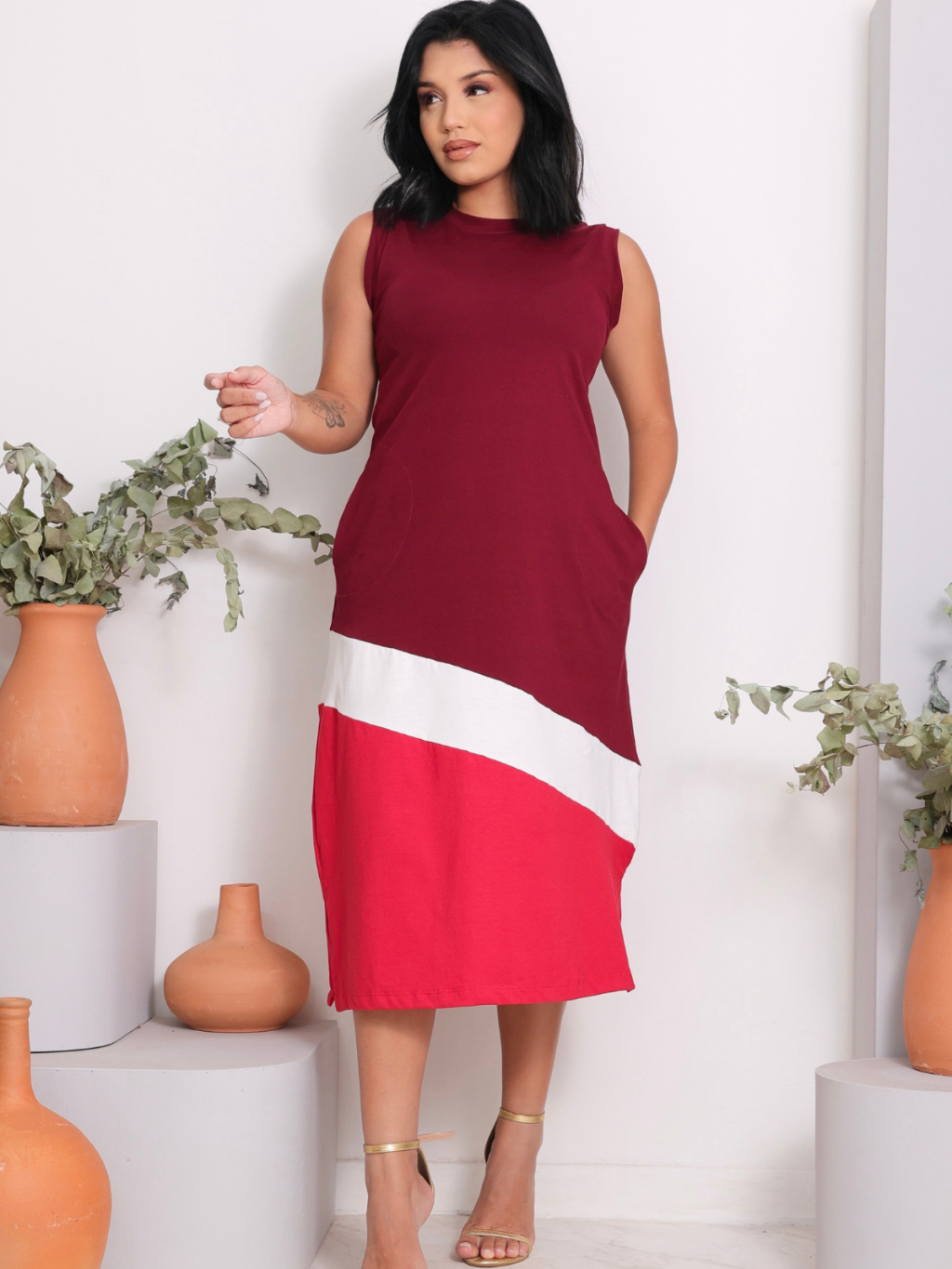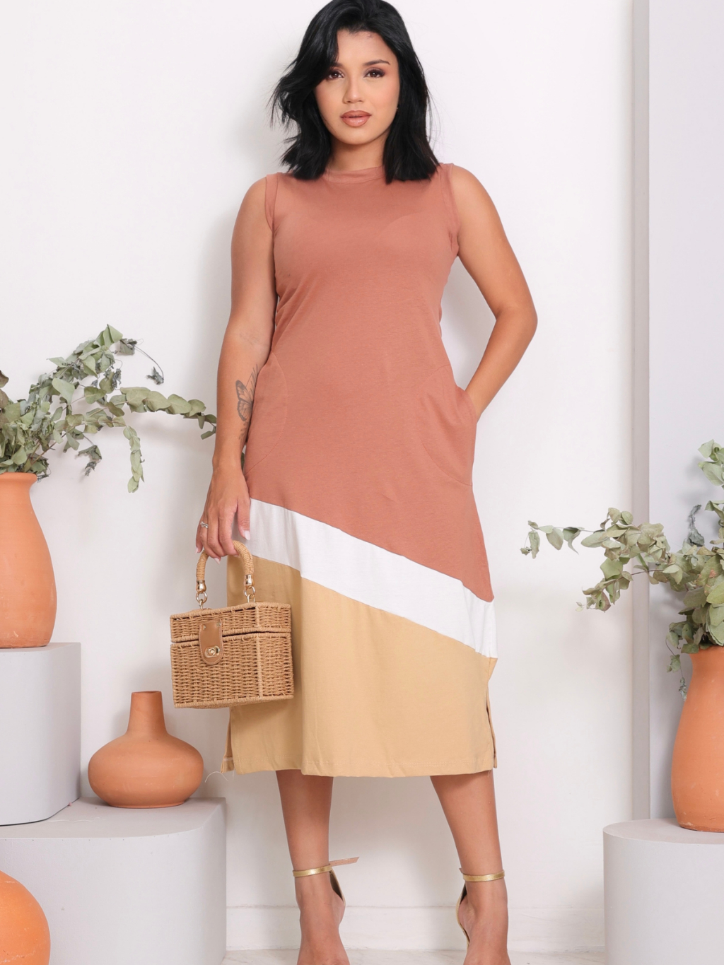 Vestido Mid Sem Manga Fenda Lateral e Bolso Embutido Varias Cores Elegante Casual Tendencia Moda Social Noite Dia