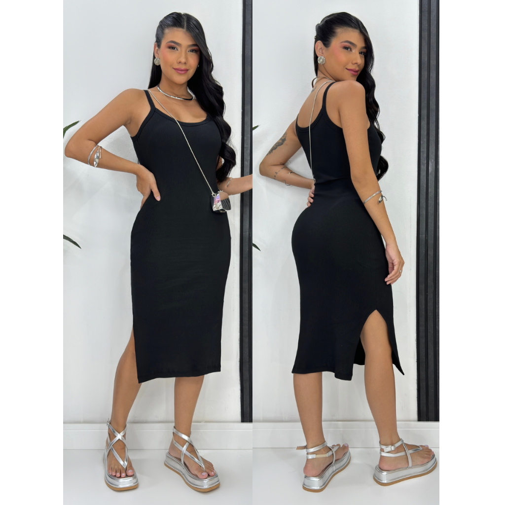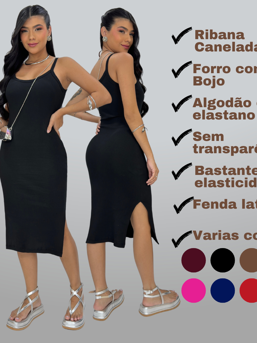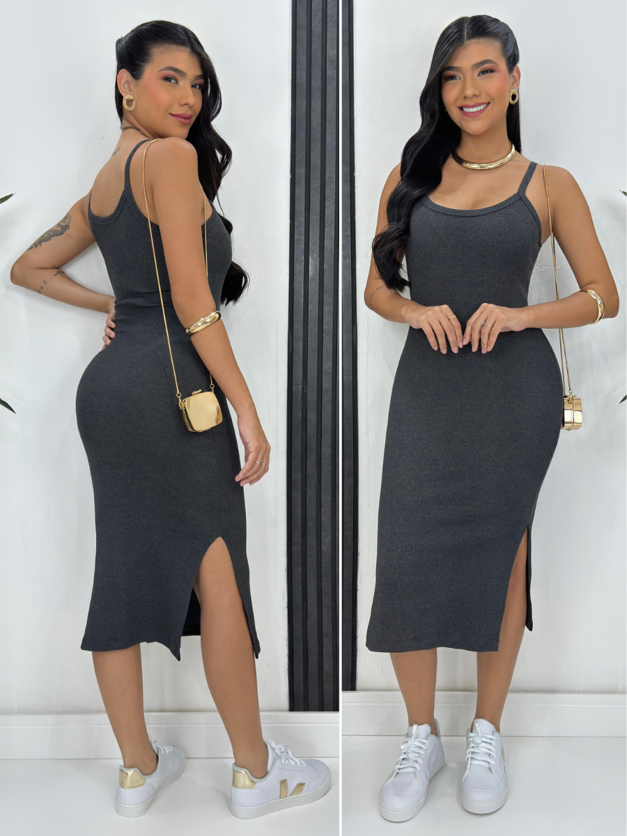 Vestido Mid Alça Ribana Canelada Algodão com Elastano com Bojo Fenda Lateral Festa Dia a Dia Casual Elegante Gestante