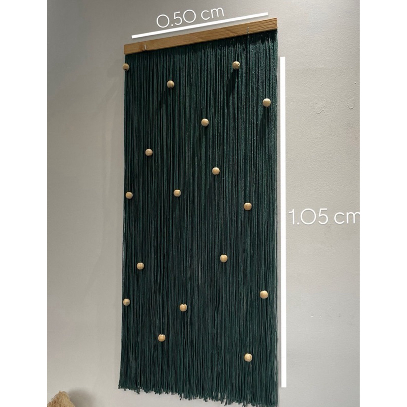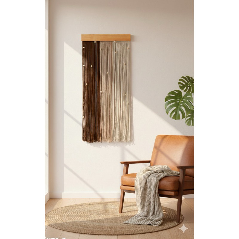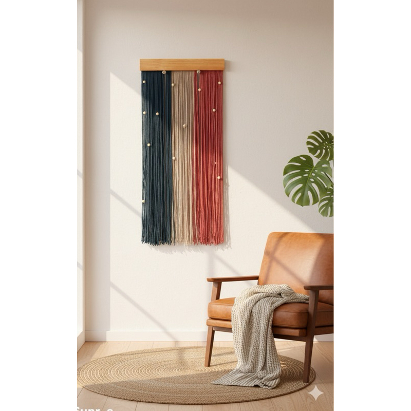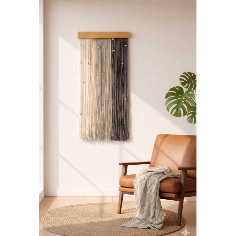 Quadro decorativo com franjas e bolas em madeira - estilo moderno boho chic