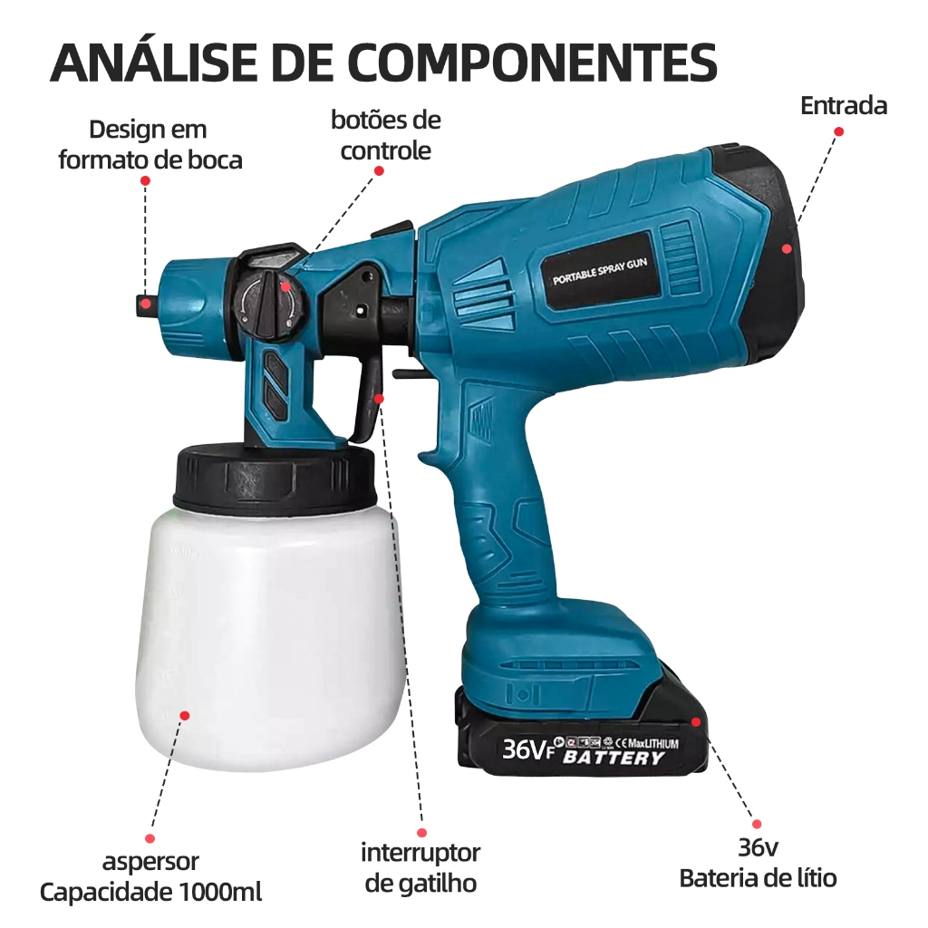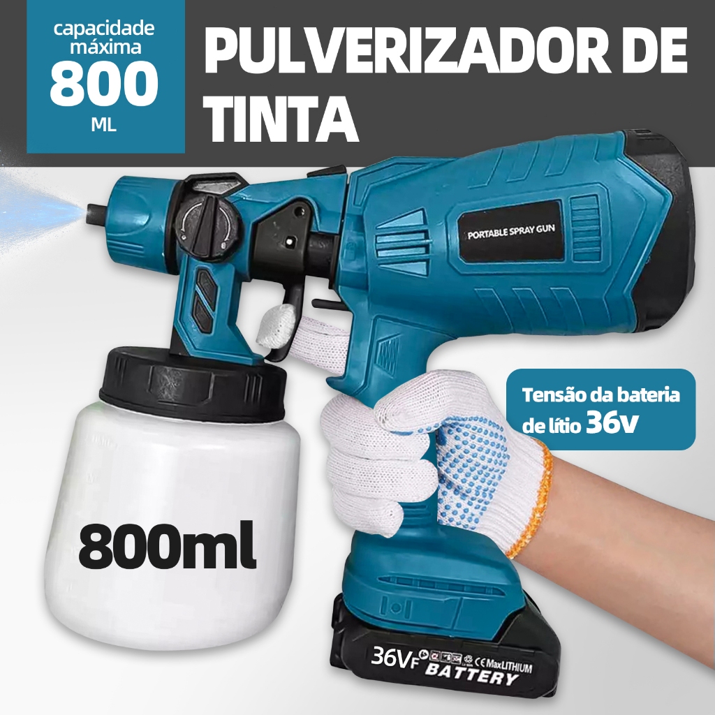 Pistola de Pintura Portátil 36V Sem Fio 2 Baterias de Lítio