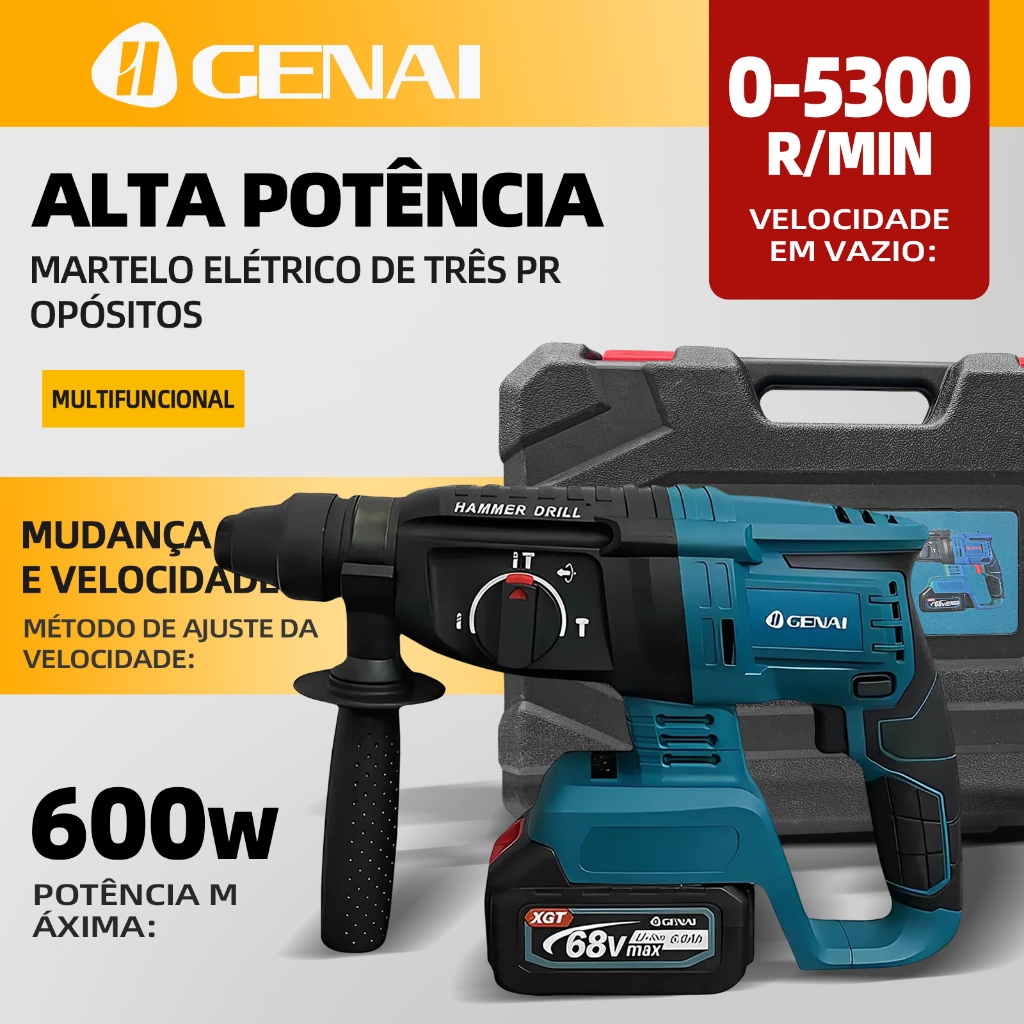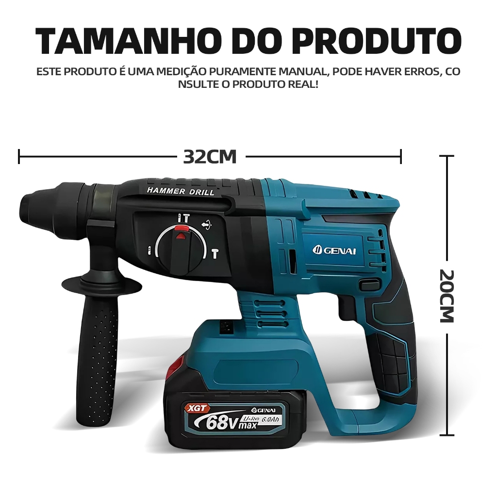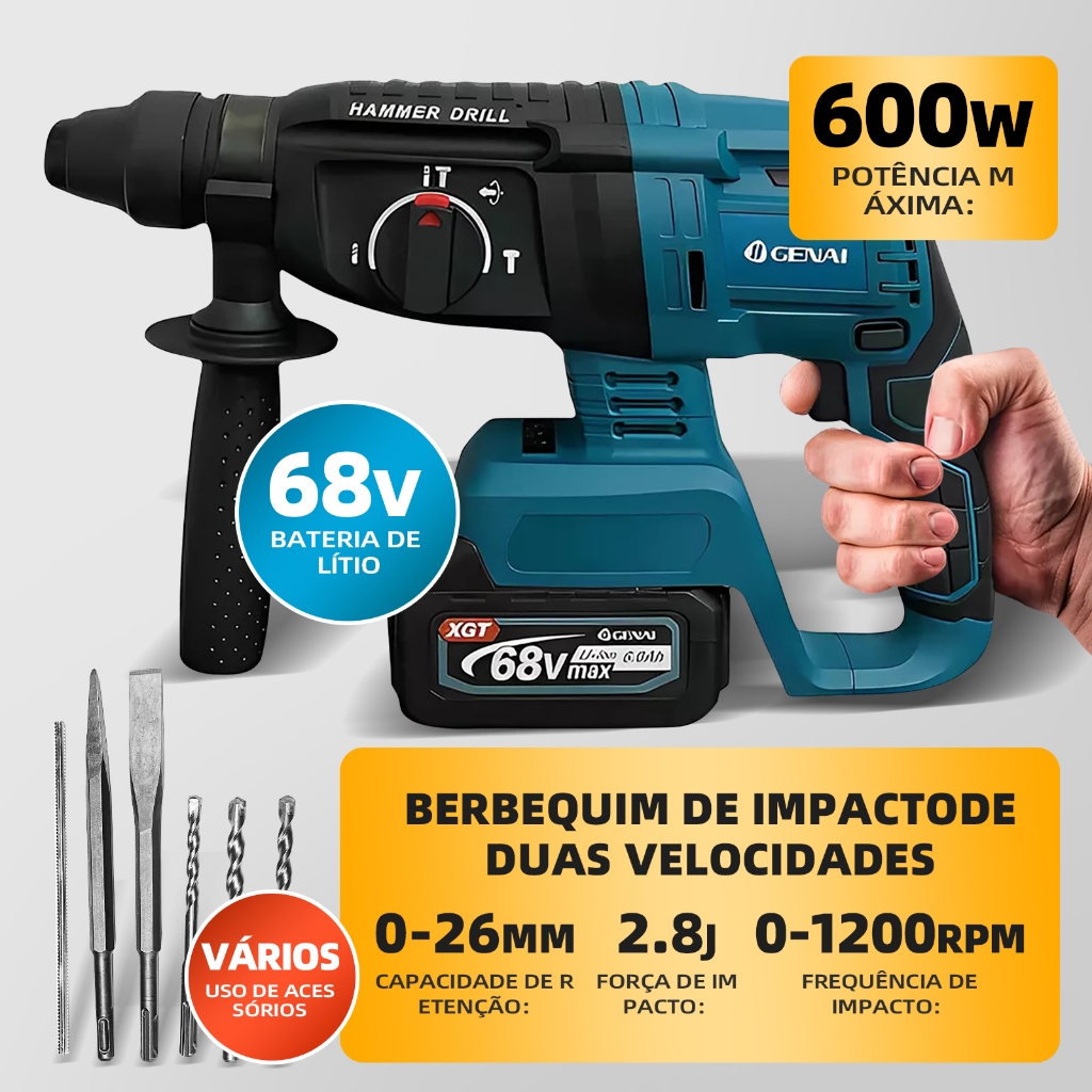 600W Furadeira de parede 21/68V com martelo 26MM 2 Baterias
