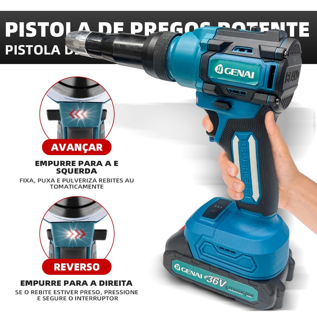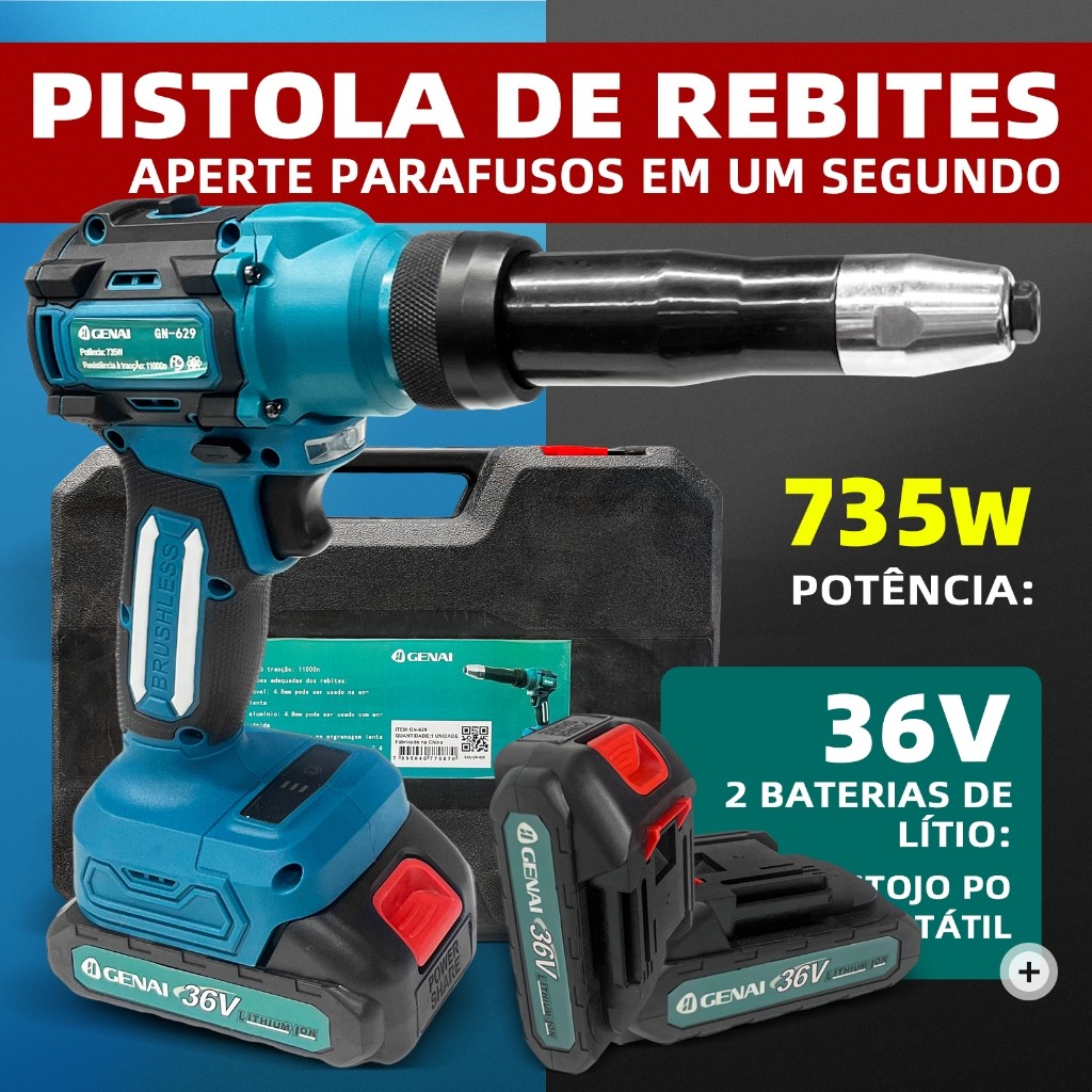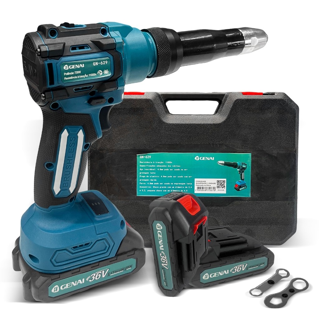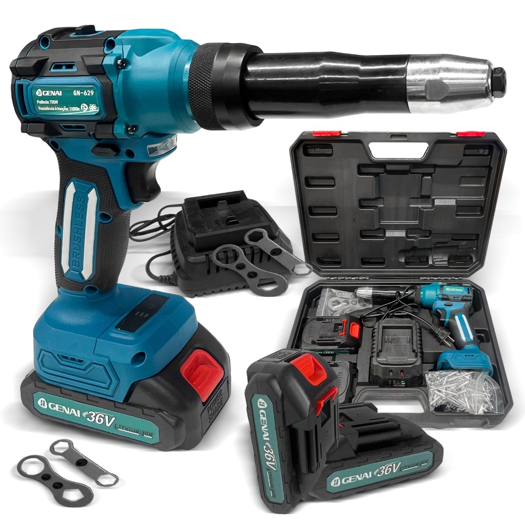 Rebitador a Bateria 36V para Oficinas e Indústrias - Kit com 2 Baterias + 100 Rebites