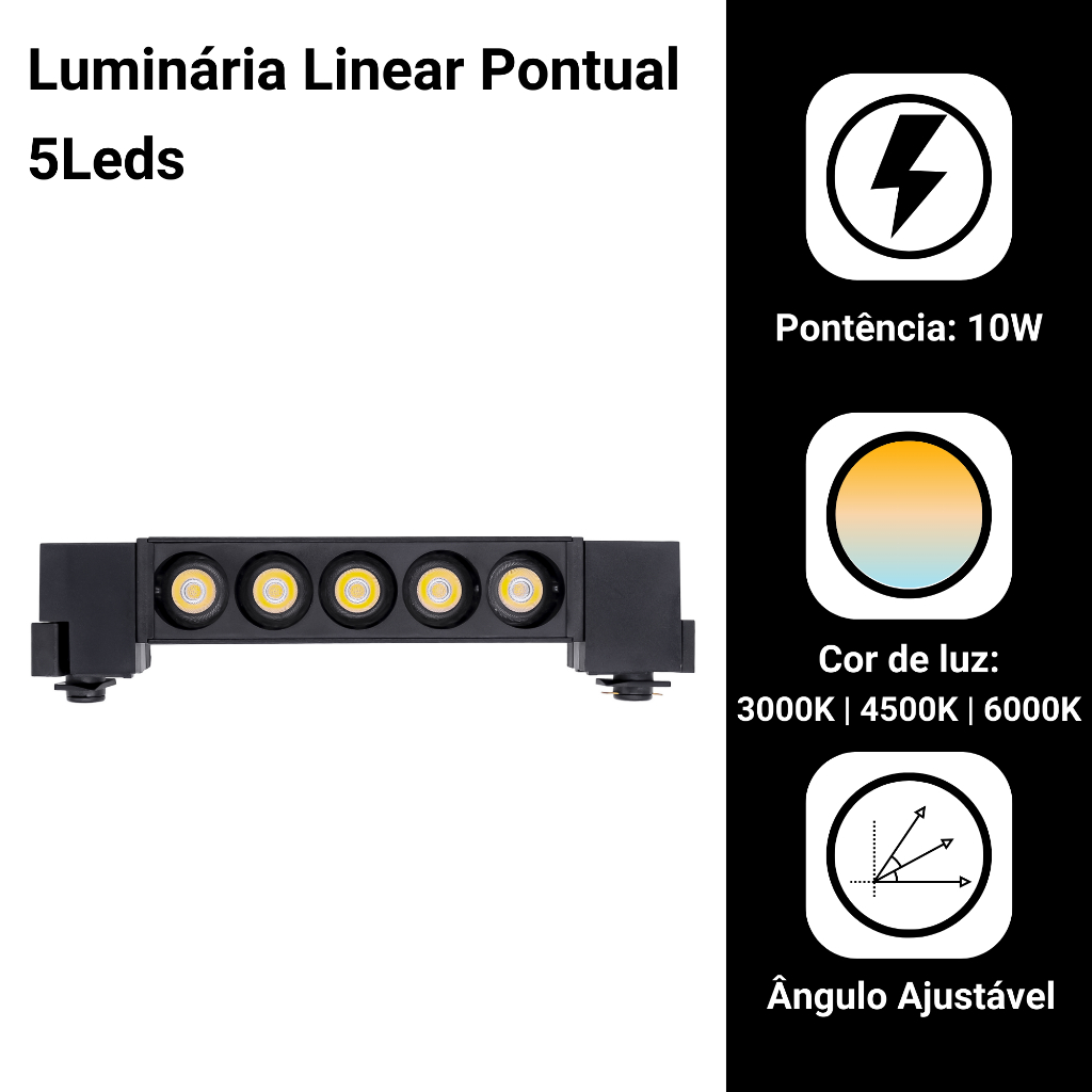 Luminária Led Linear Pontual P/trilho 5leds 10w Bivolt Preto