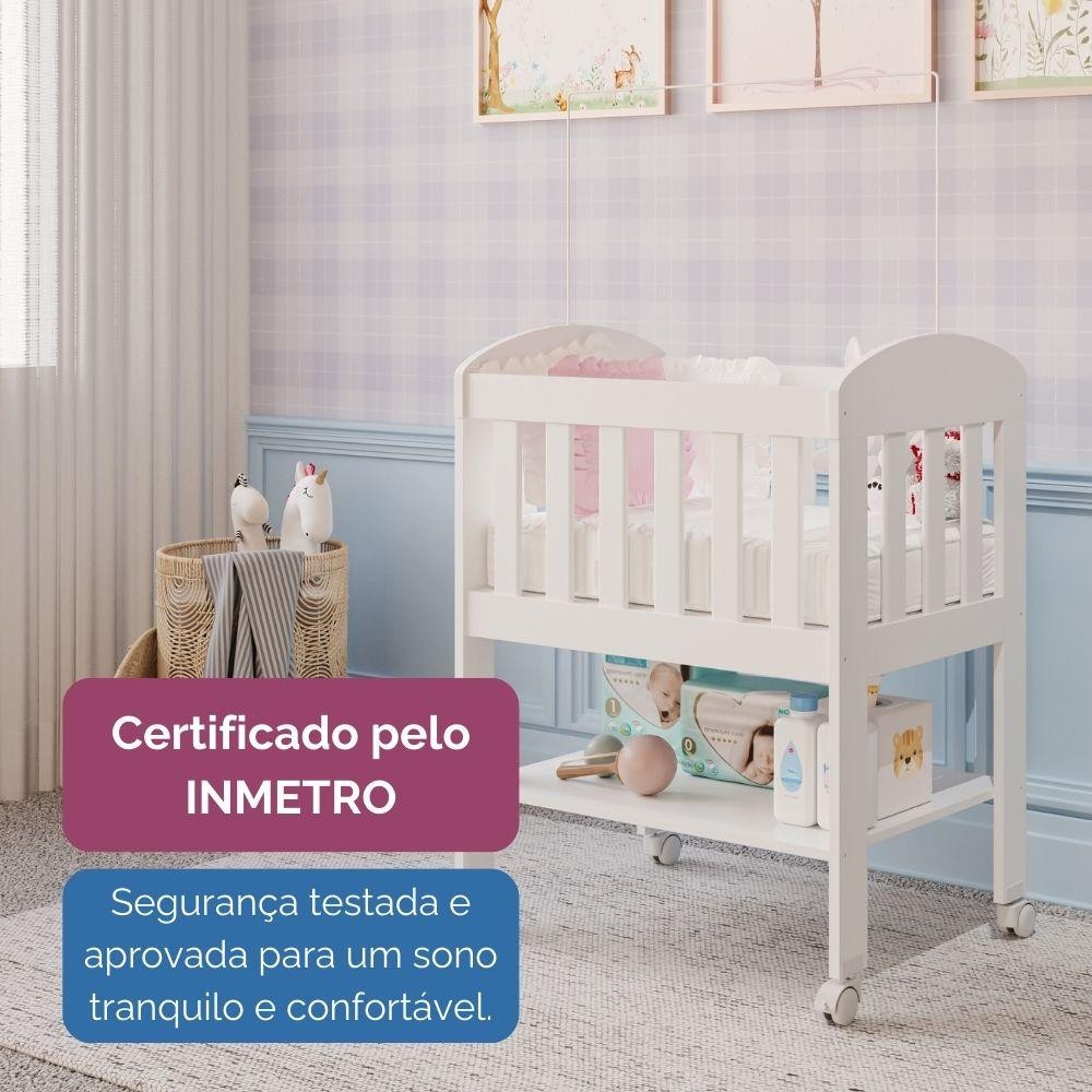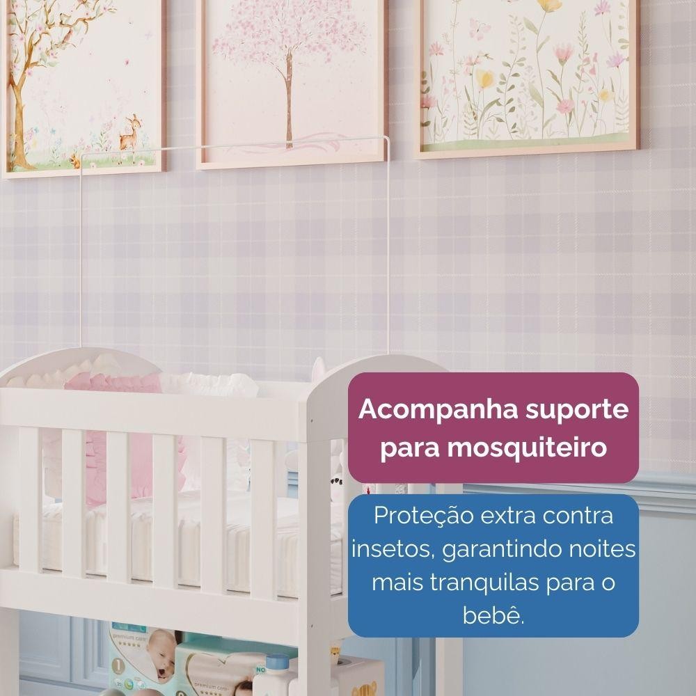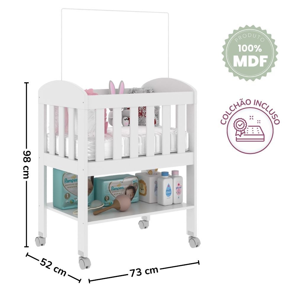 Mini Berço Bia 100% MDF com Colchão, Rodízios, Prateleira e Suporte para Mosquiteiro Carolina Baby