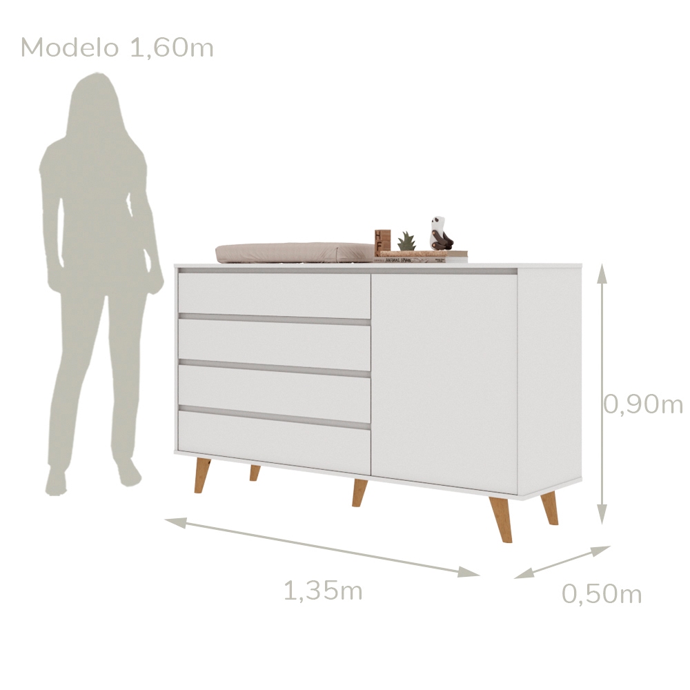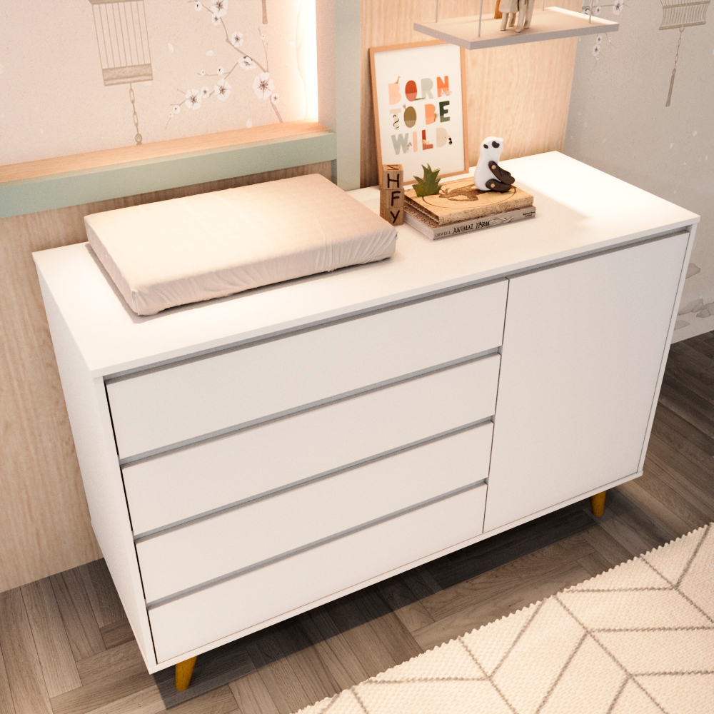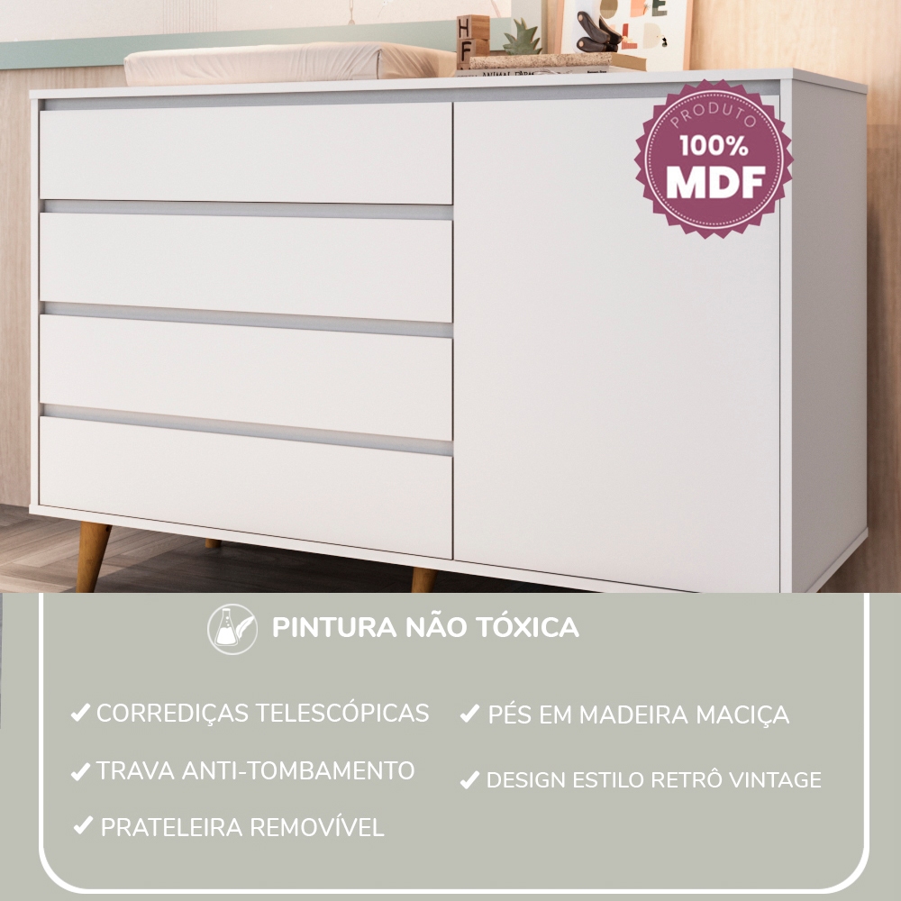 Cômoda Infantil Pé Palito 4 Gavetas com Porta Fraldário Gran Lorena 100% MDF Branco
