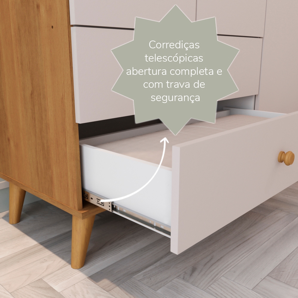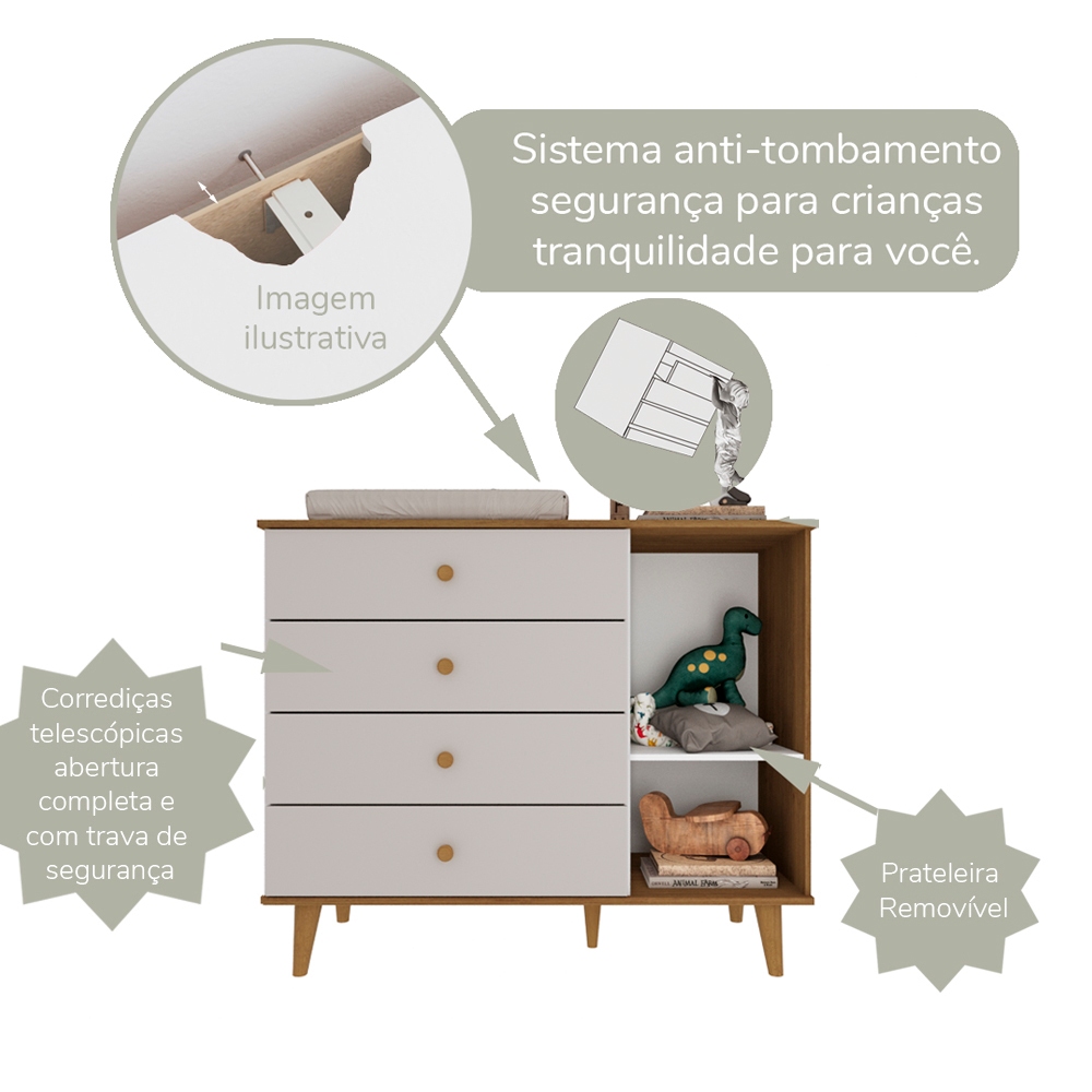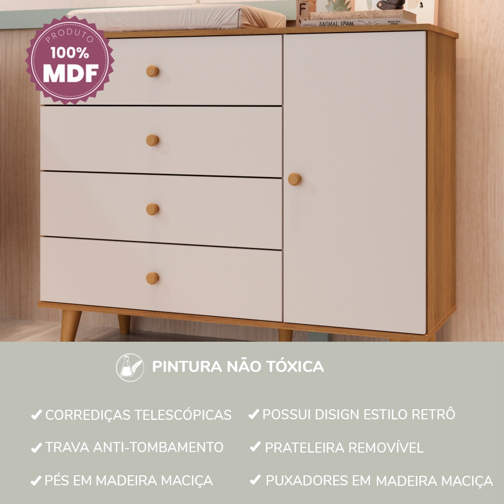 Cômoda Infantil Retrô 4 Gavetas com Porta Fraldário Pés Palito Lígia MDF Off White