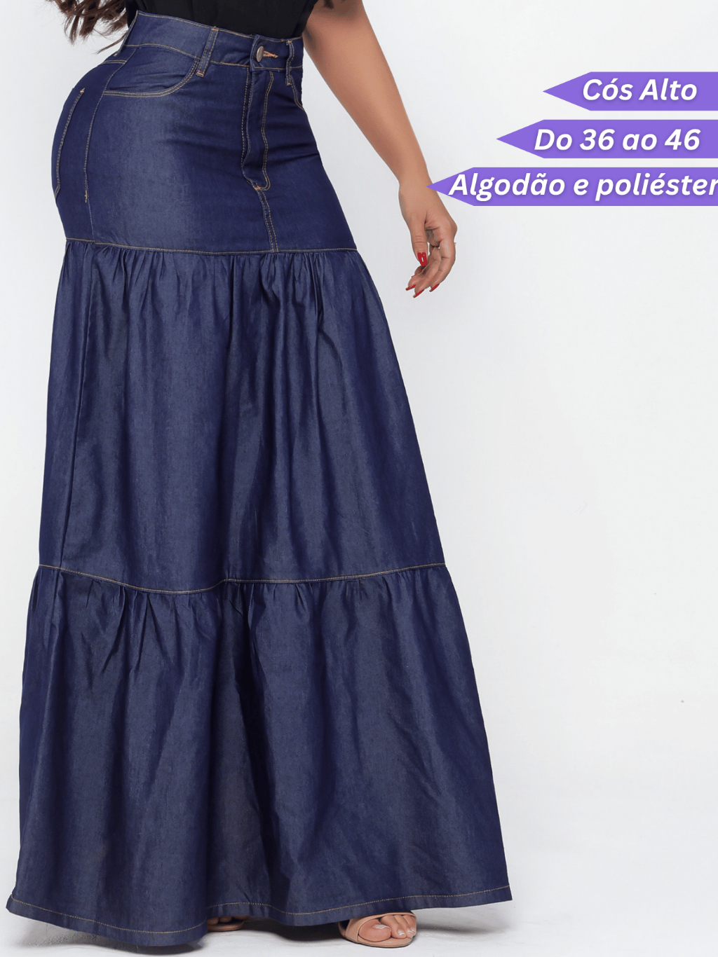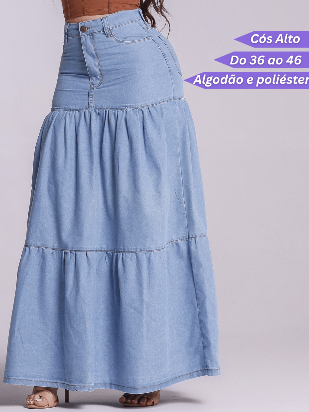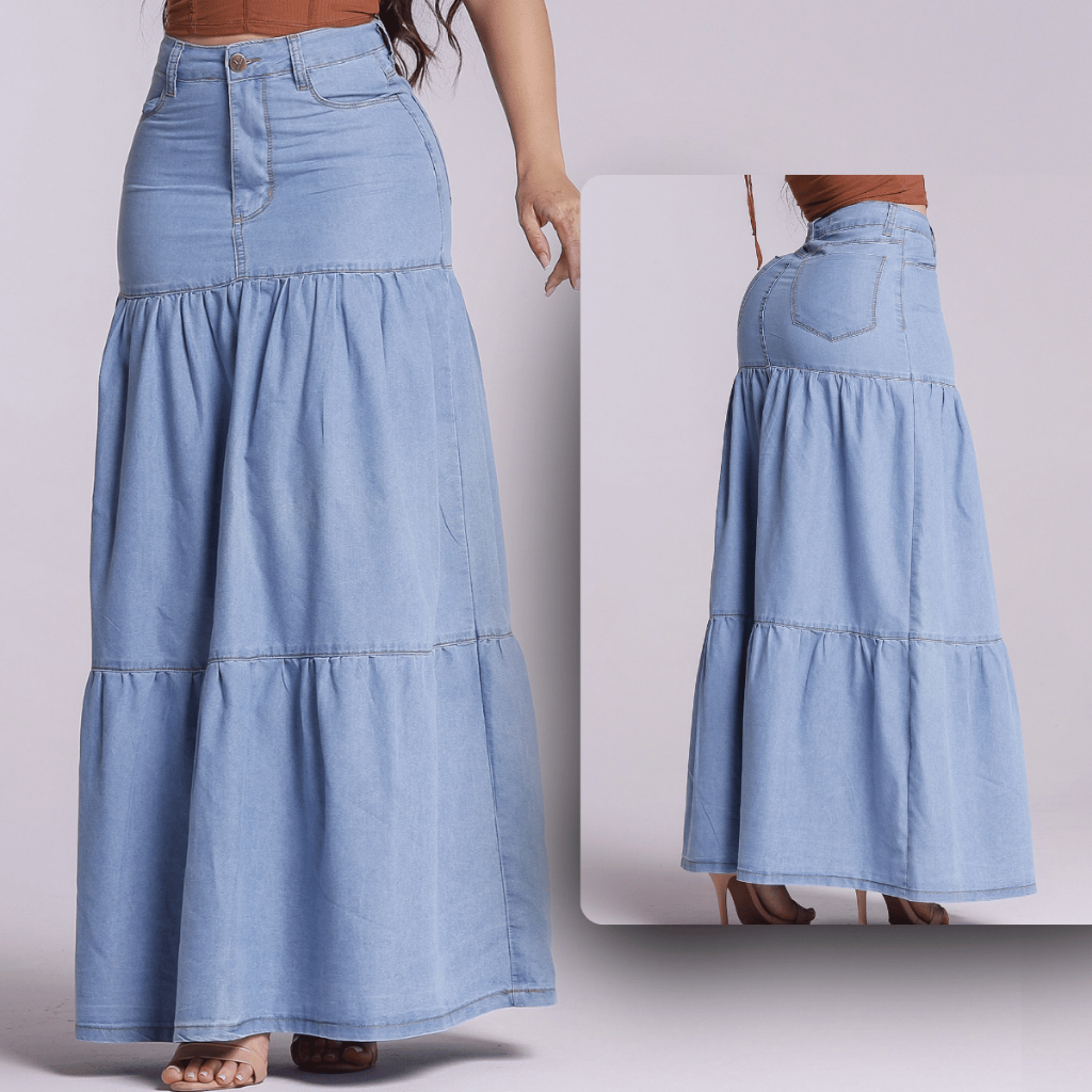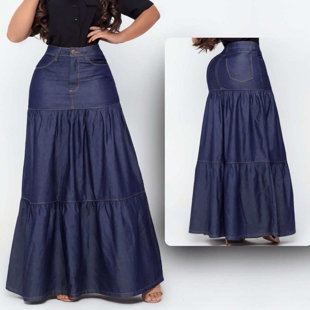 Saia Jeans Longa Feminina Evangélica Leve Sem Lycra 3 Marias Cós Alto Rodada Casual Confortável