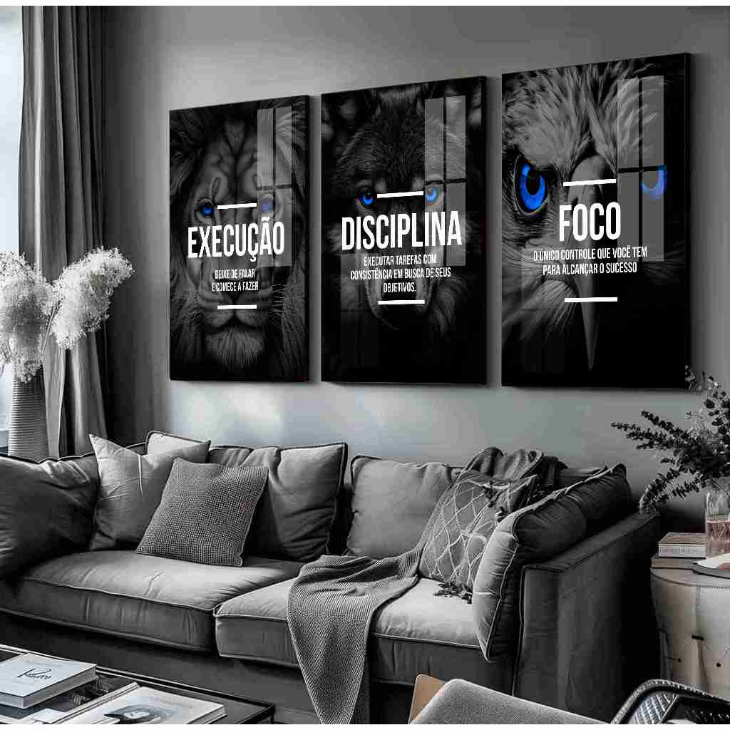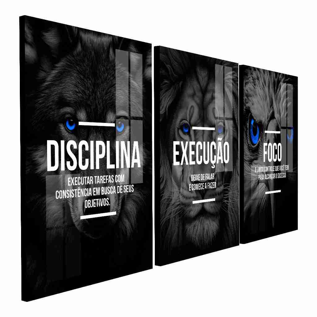 Quadro Decorativo Leão Execução Águia Foco Disciplina Lobo Frase Motivação Sala Quarto Empresa