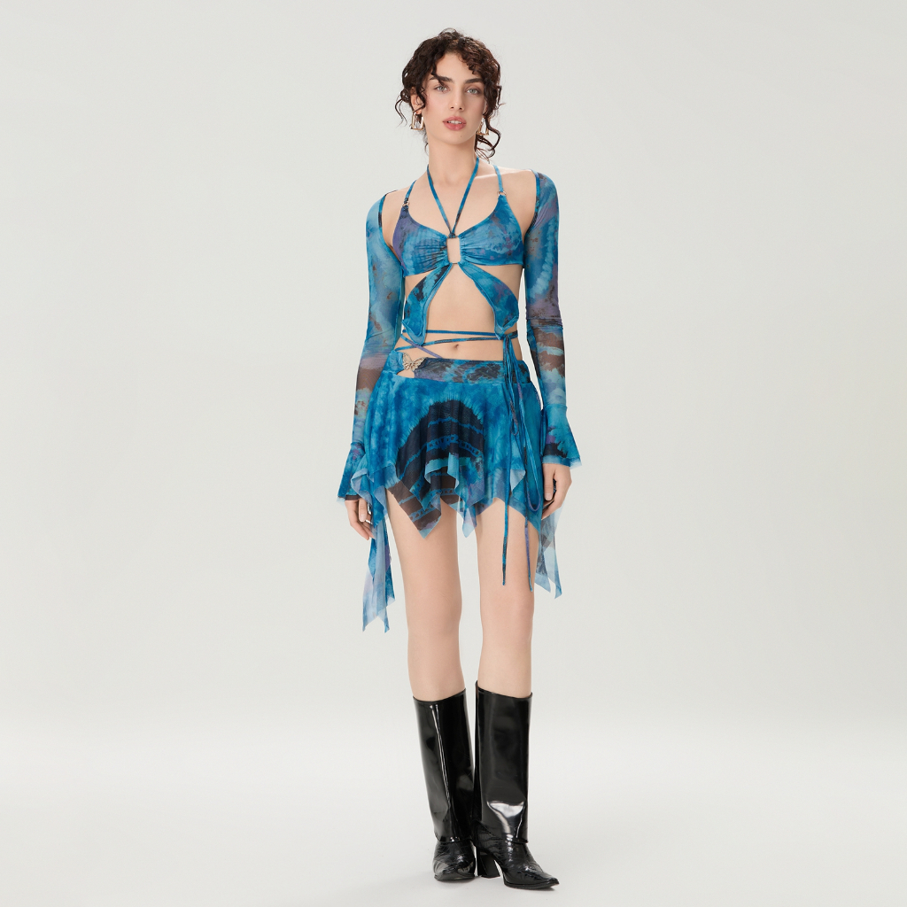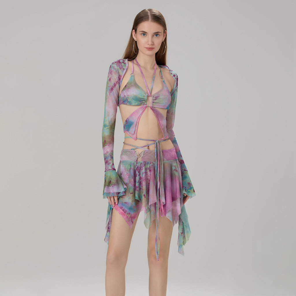 Conjunto Feminino 3 Peças: Blusa Manga Longa com Borboleta e Franja, Colete Tie Dye e Saia Mini Irregular, Verão