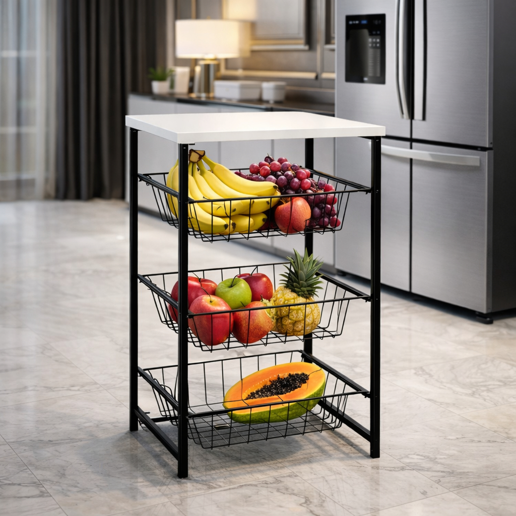 Fruteira 3 Cestos Cozinha Preta Em Aço Tampo em Mdp Cesto Organizador Multiuso