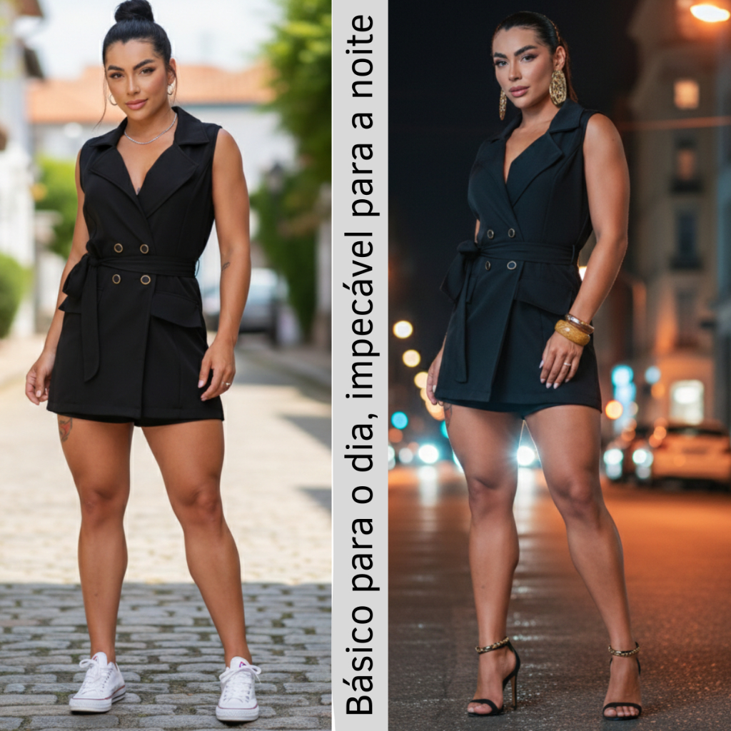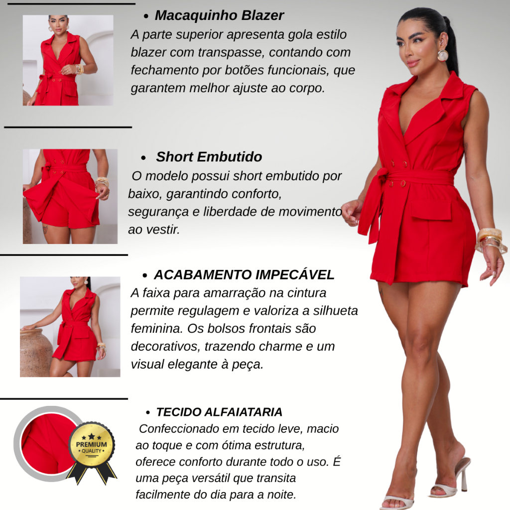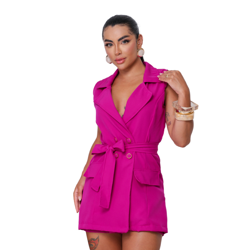Macaquinho Blazer Feminino Alfaiataria Curto Social Elegante com Cinto e Botões