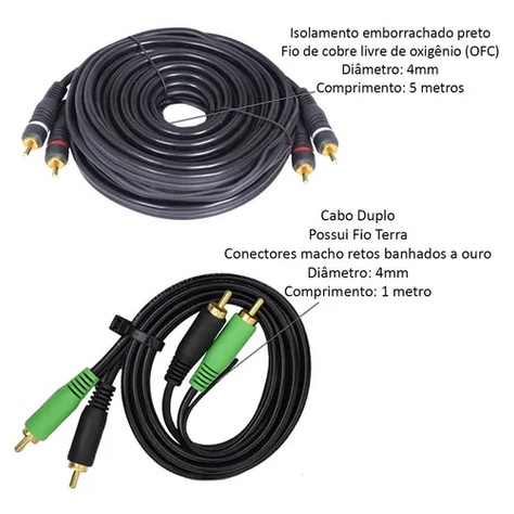 Kit Cabo Rca Emborrachado 5 Metros + 1 Cabo Rca 1 Metro Techone