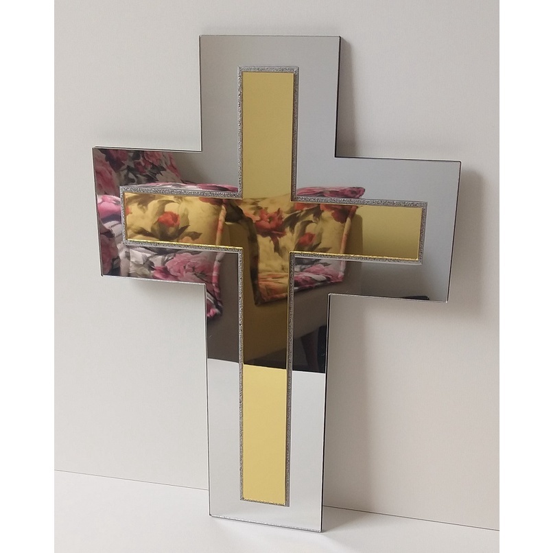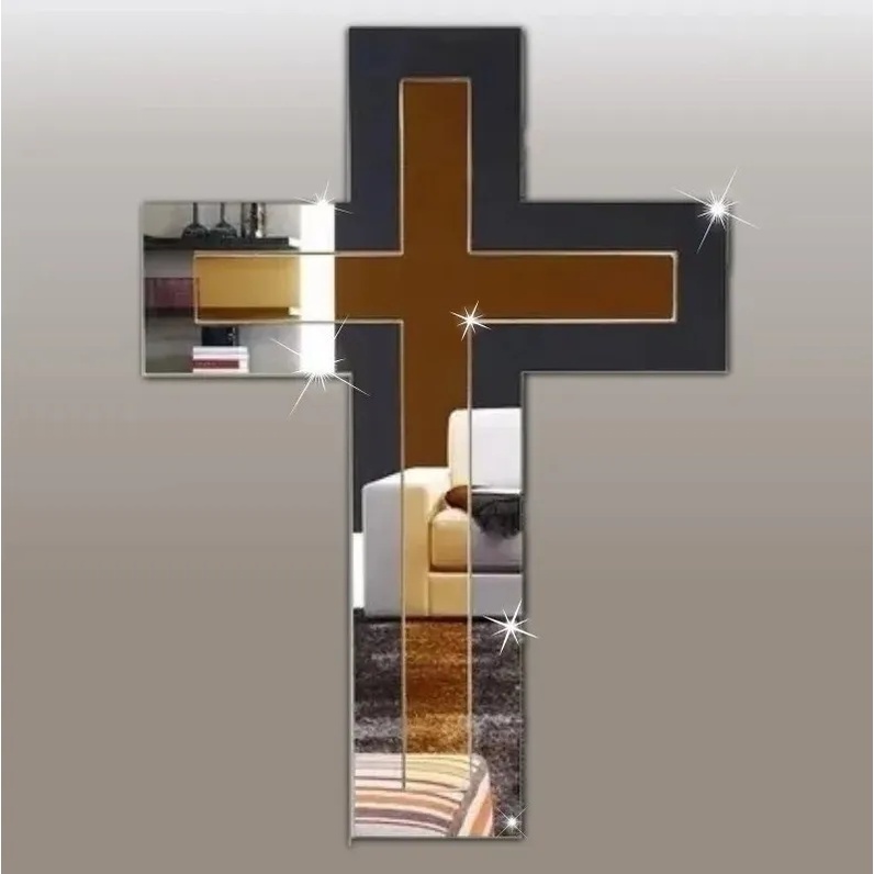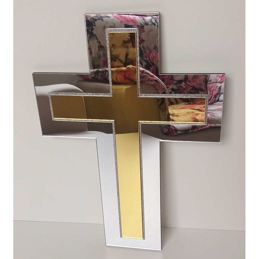 Cruz Religiosa Decorativa em Acrílico Espelhado Dourado com Crucifixo Prata Decoração Jesus 31x22