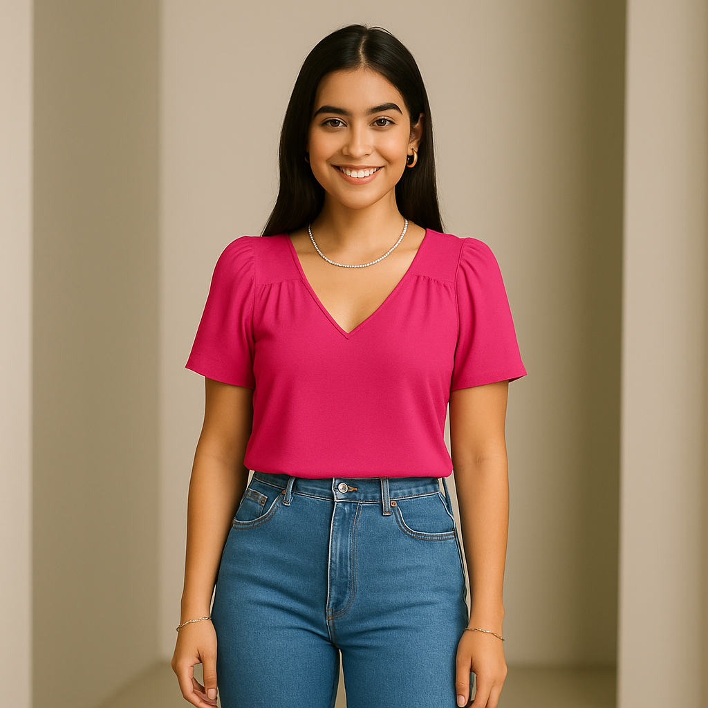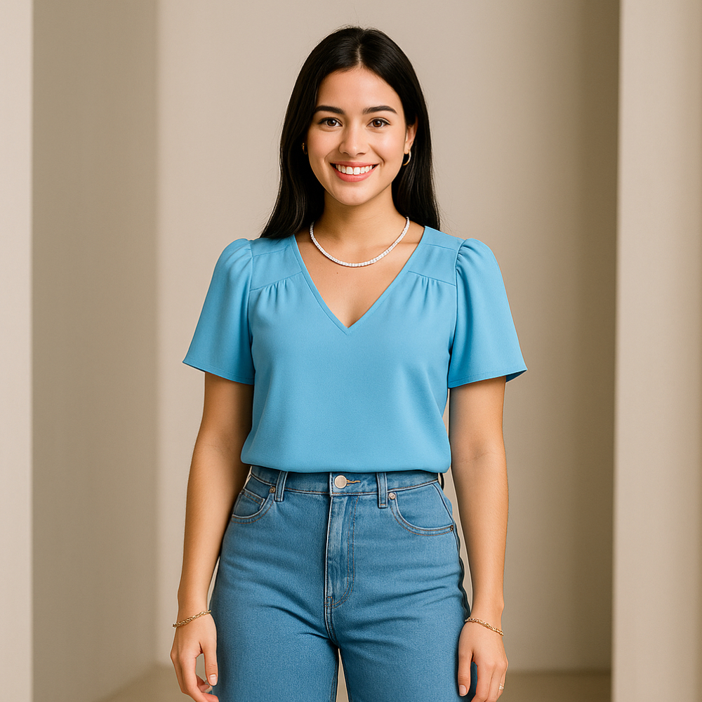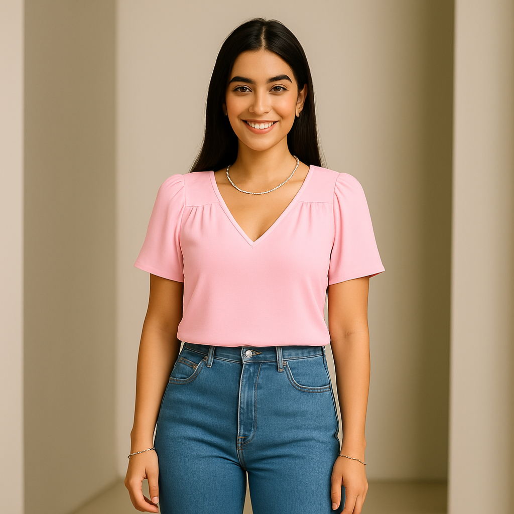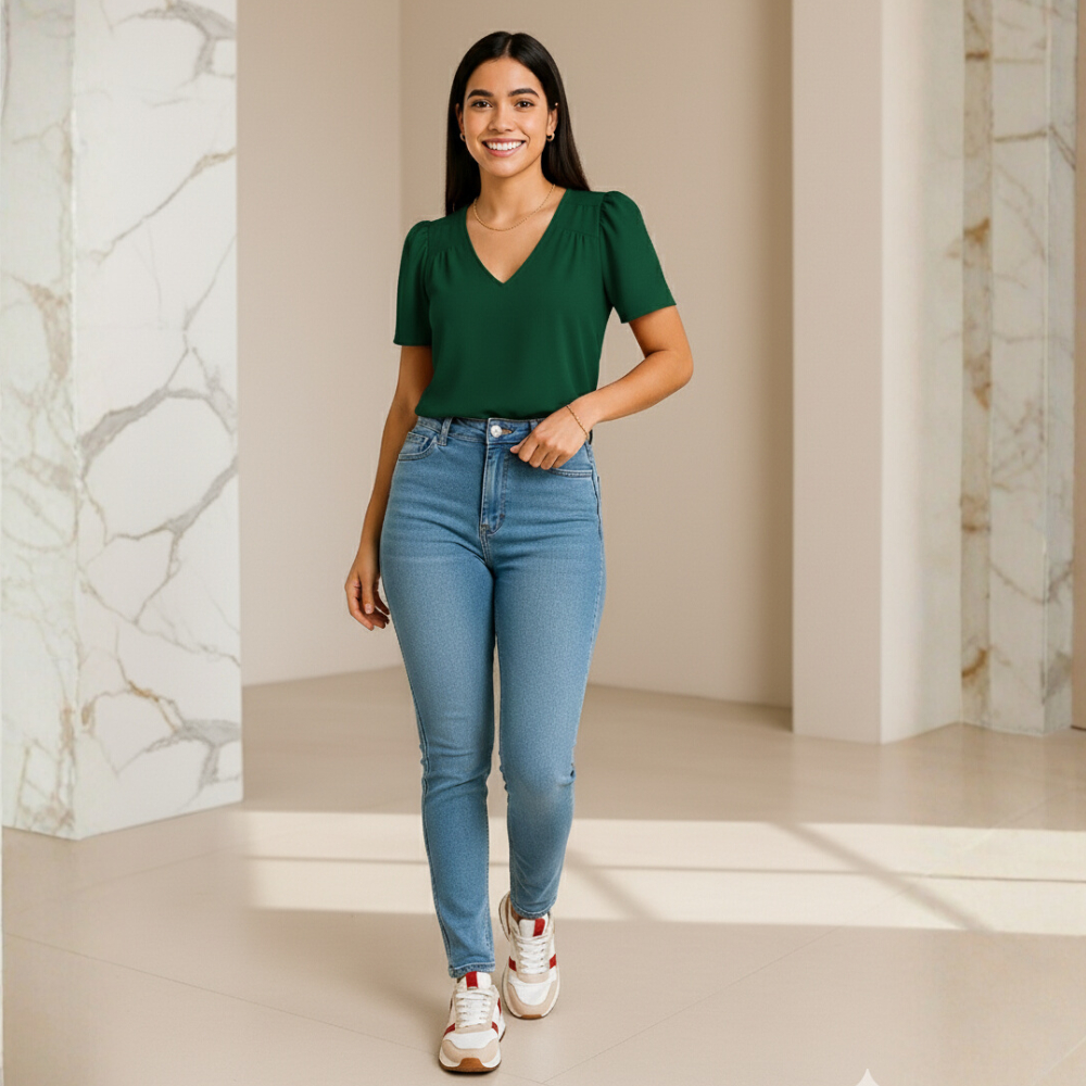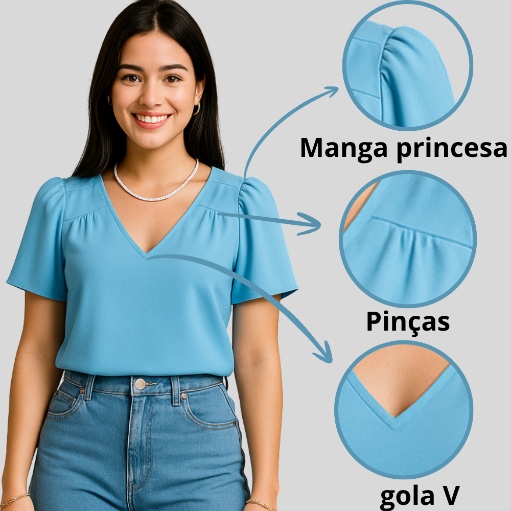 Blusa Feminina Crepinho Básica Gola V Manga Curta Moda Casual Social Elegante.