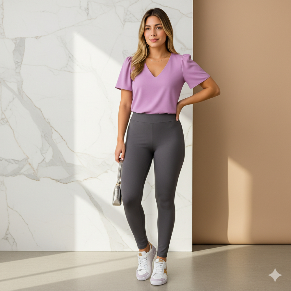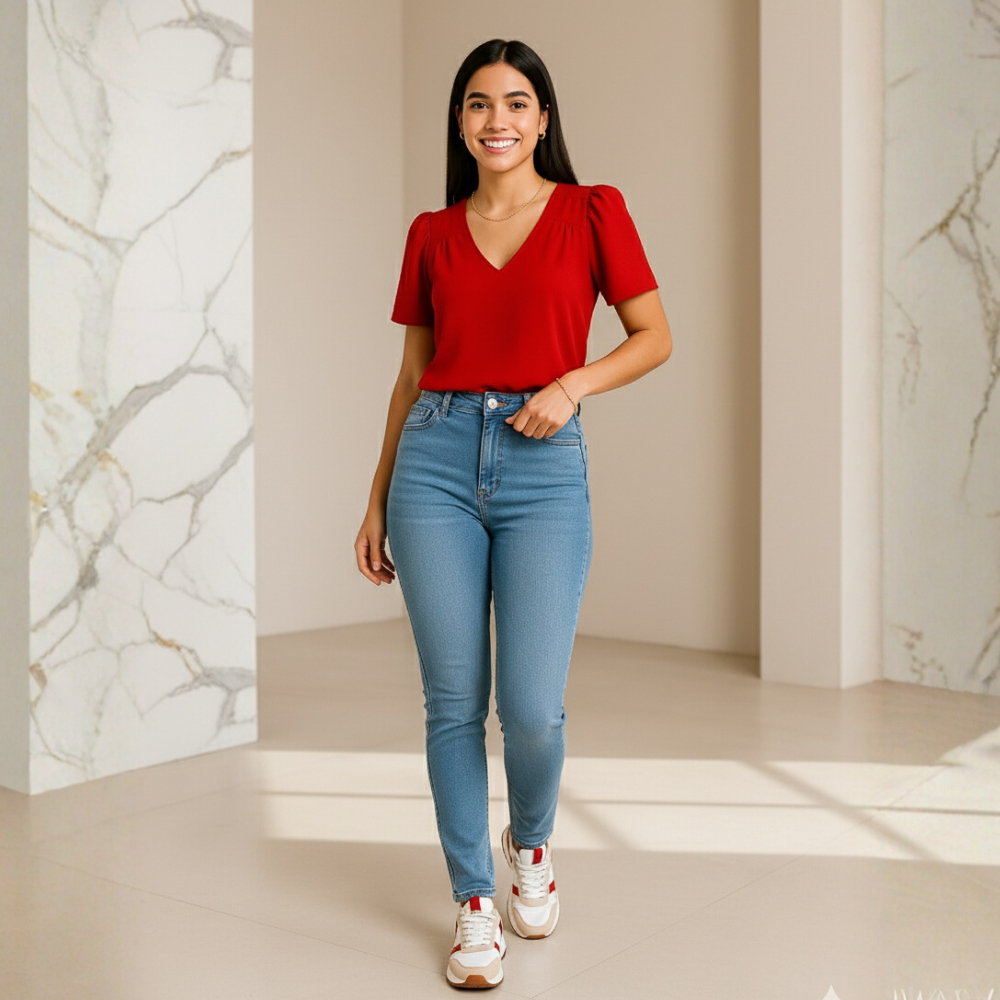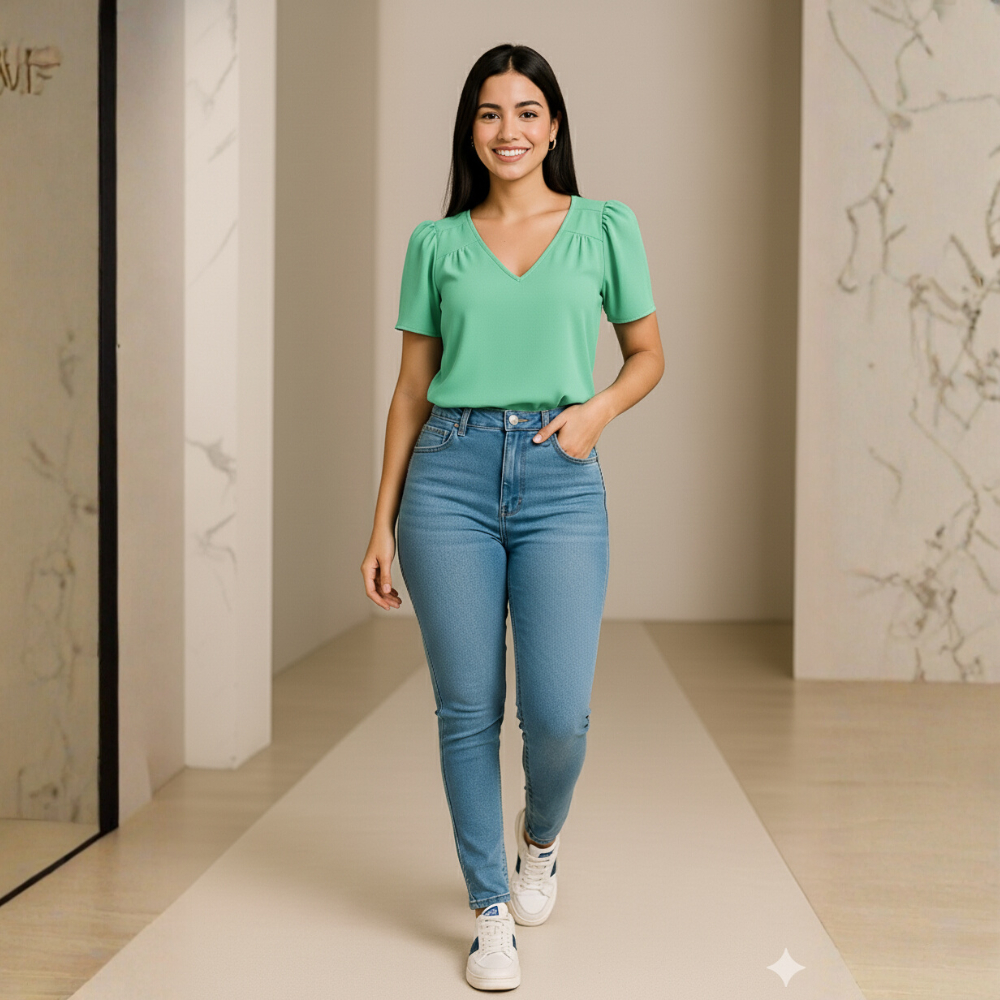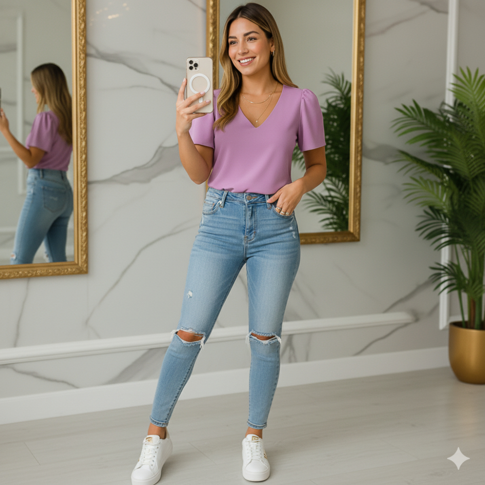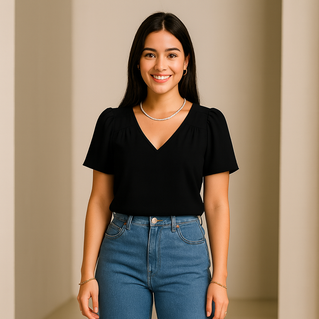 Blusa Feminina Crepinho Básica Gola V Manga Curta Moda Casual Social Elegante.