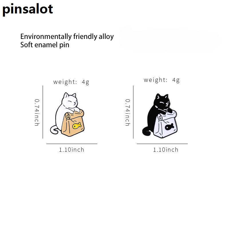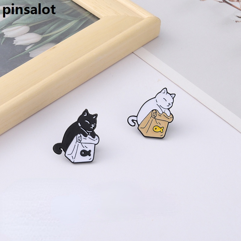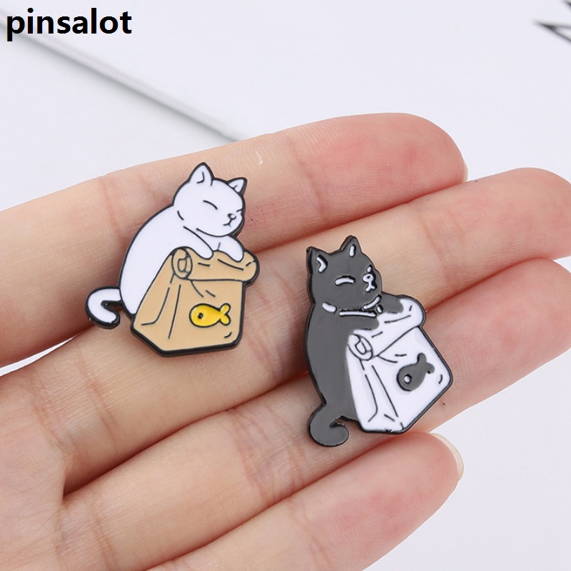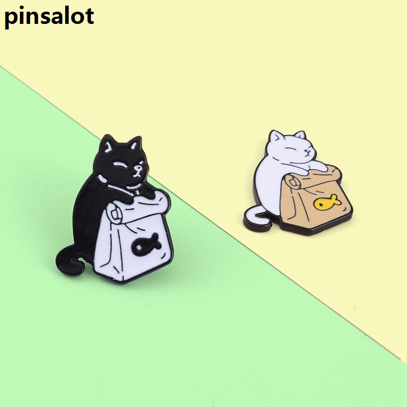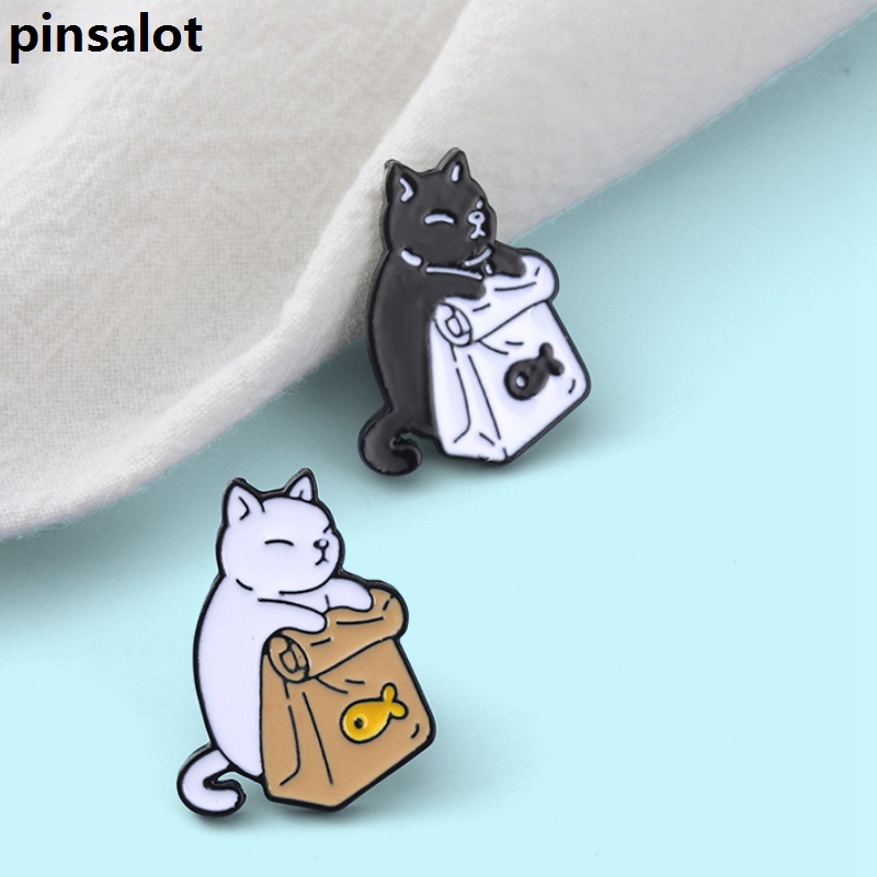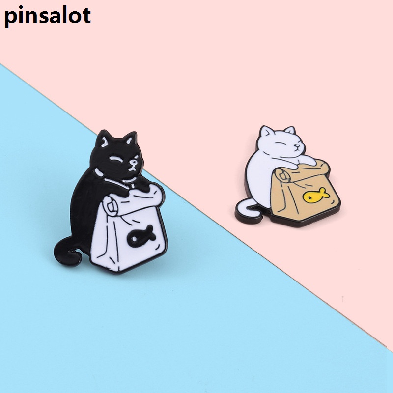 Gatinho E Peixe Esmalte Alfinetes Personalizados Branco De Comida Crachás De Lapela Para Amantes De Gato Jóias De Animais Acessórios Chapéu Atacado