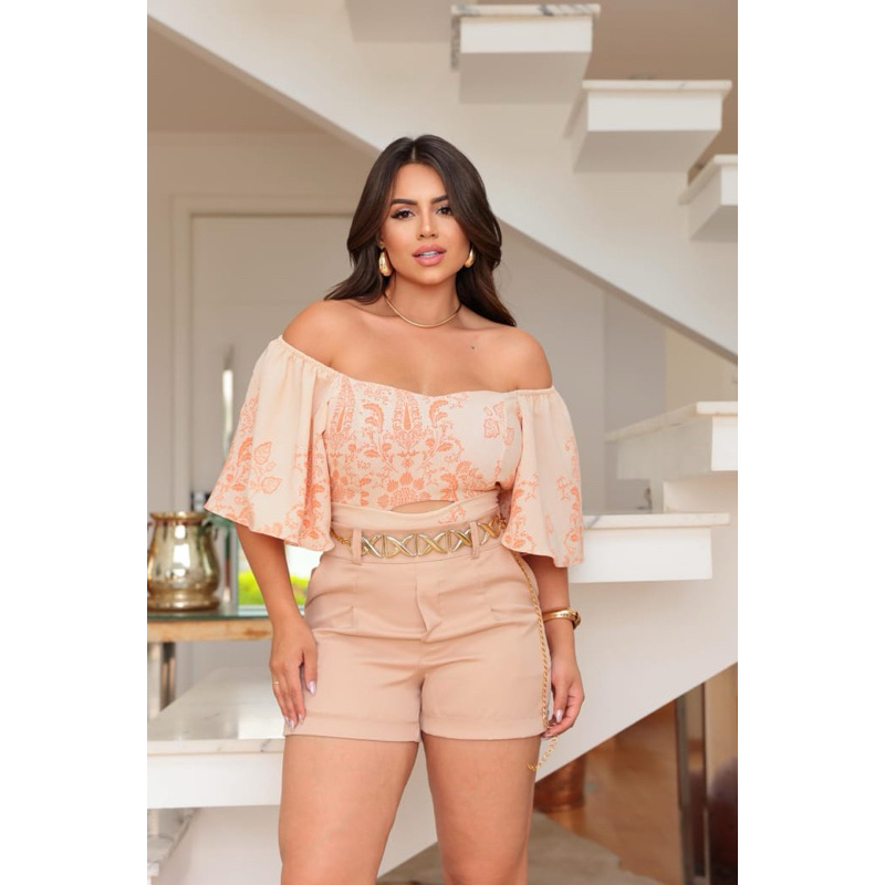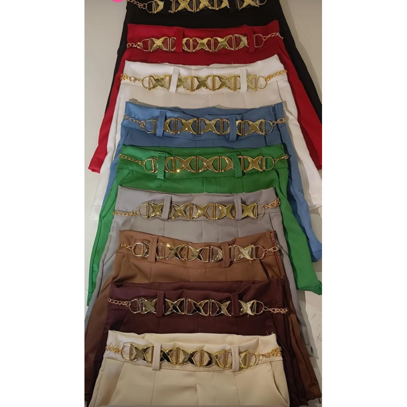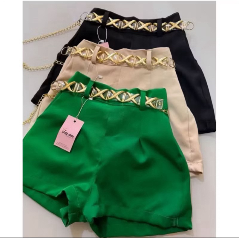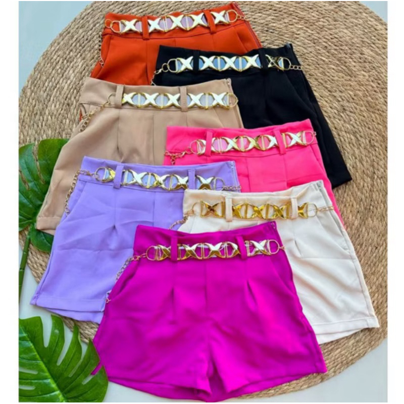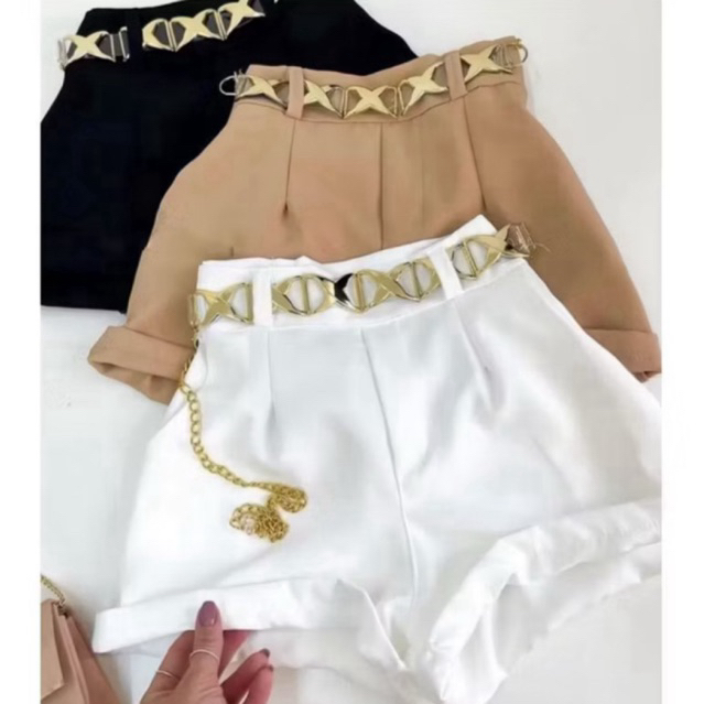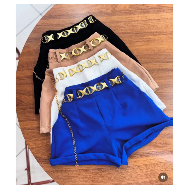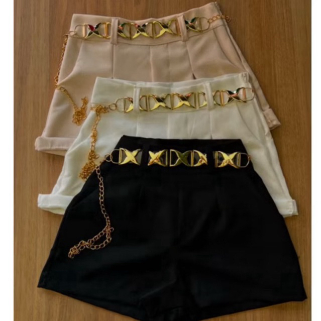 Short Feminino Estiloso Alfaiataria Cintura Alta com Cinto Corrente Tendência Verão 2025