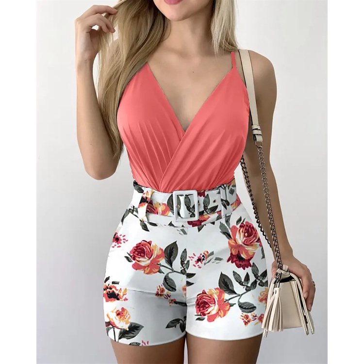 Conjunto De Duas Peças Short Bodycon Com Decote Em V E Estampa Florida Cinto Para Mulheres 2022