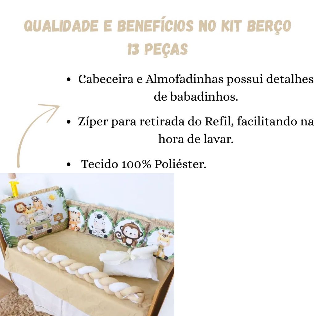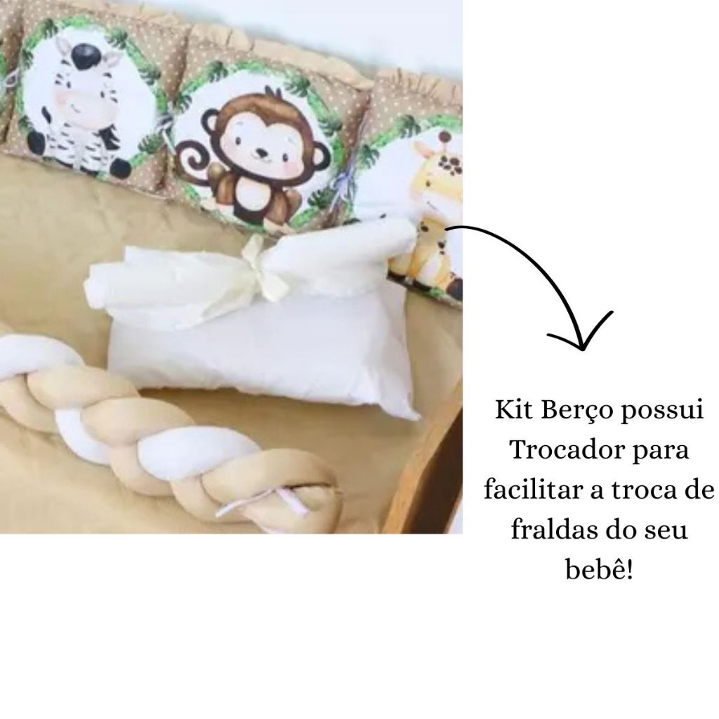 Kit Berço Protetor Americano Almofadinhas e Trança 13 Peças Safári Caqui