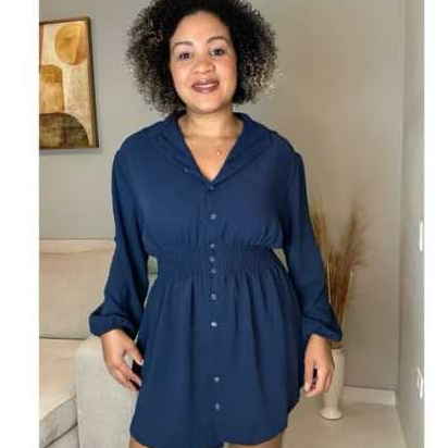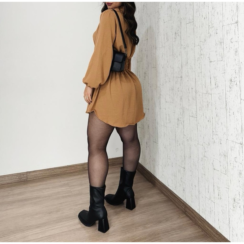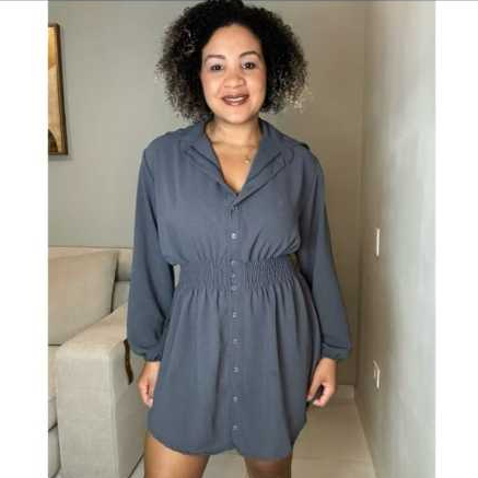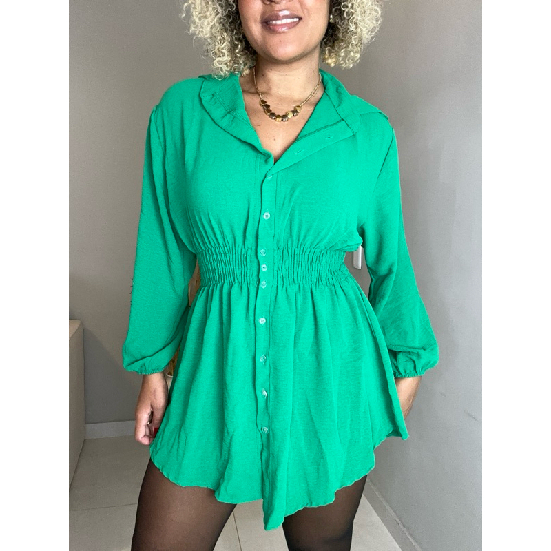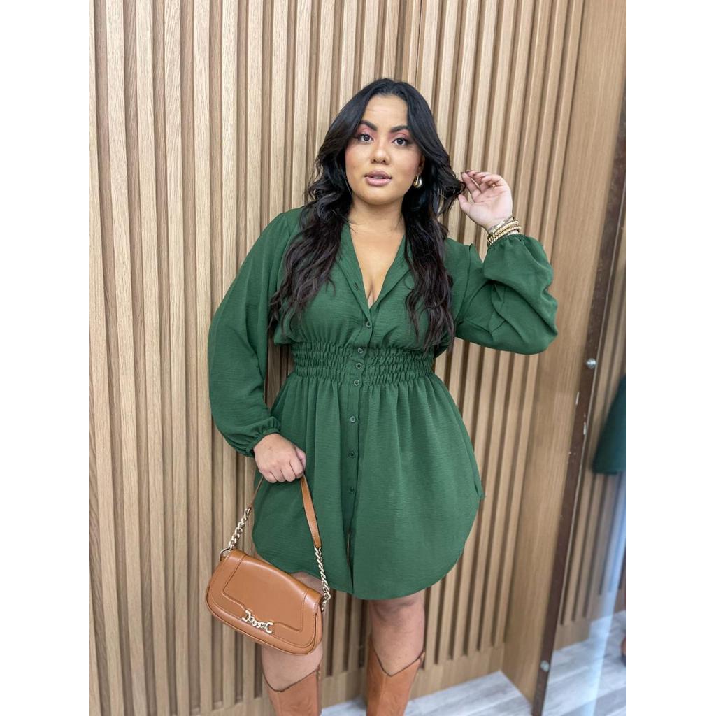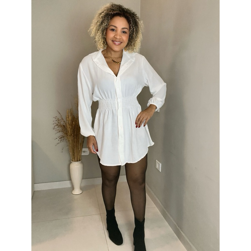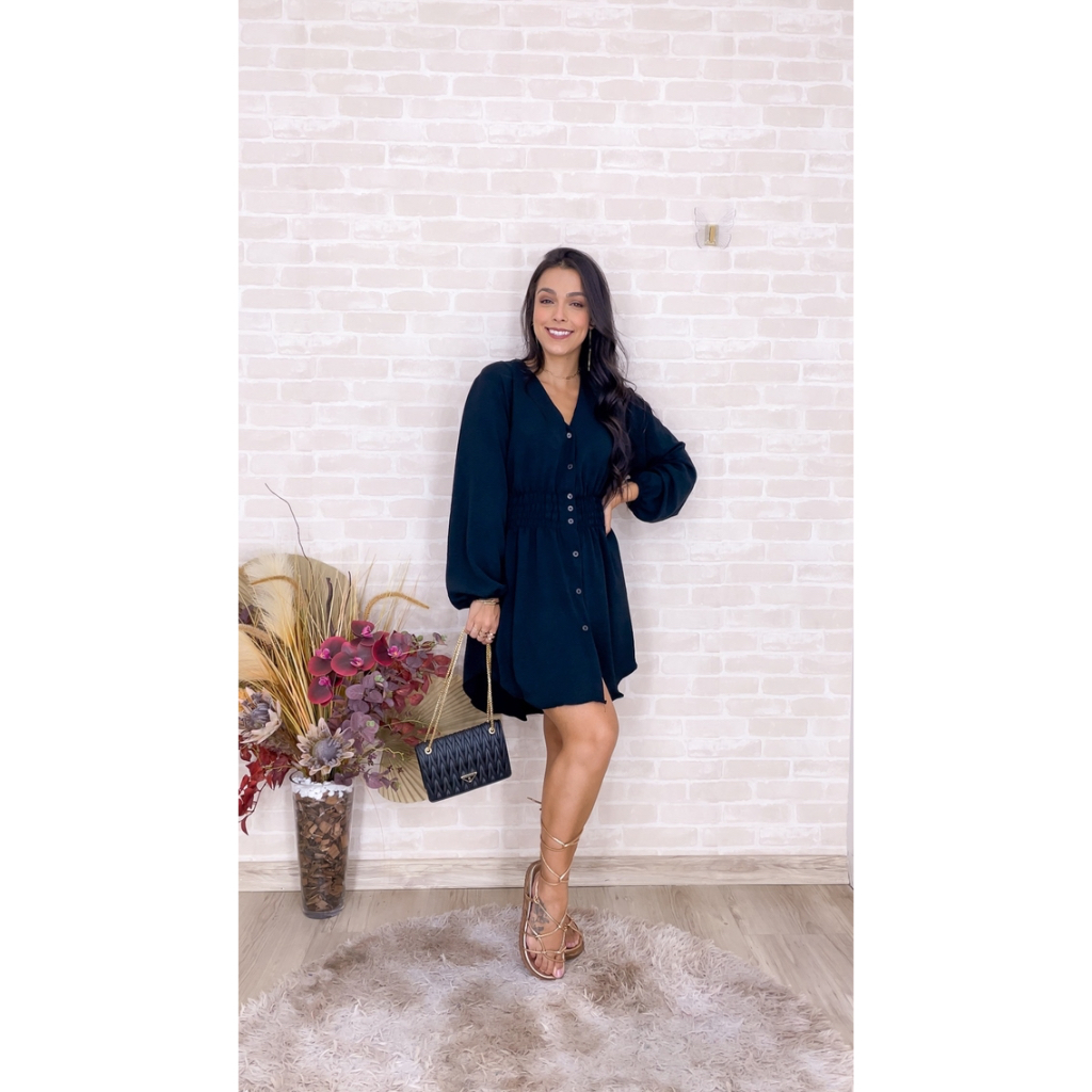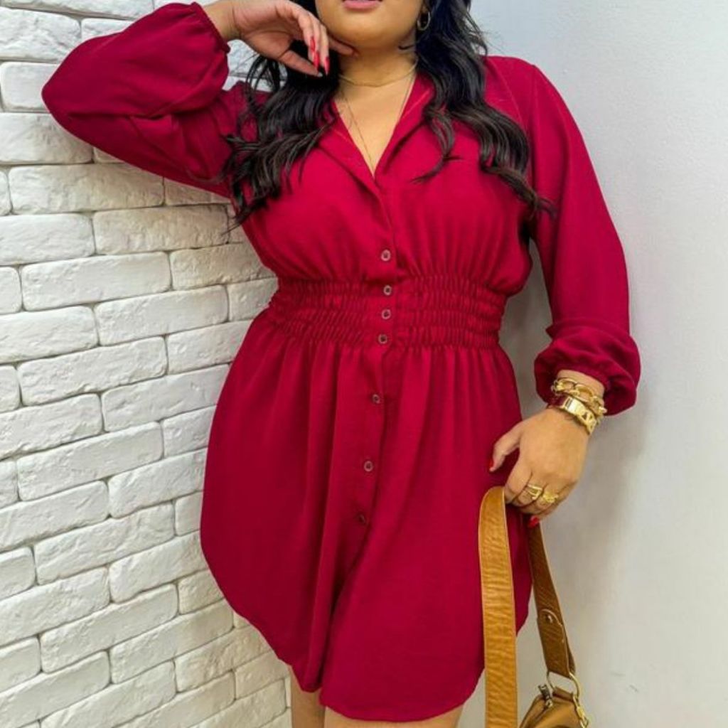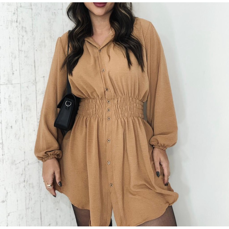 Chamise Manga Longa de Botões Lastex na Cintura, Vestido Feminino.