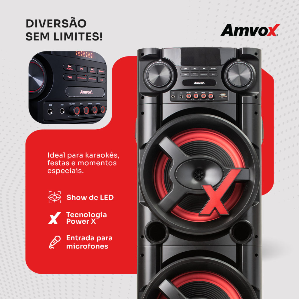 Torre Som 1300W Amvox ACA1300 NewX Duplo Woofer 10 Led TWS USB Bivolt bluetooth sem FM