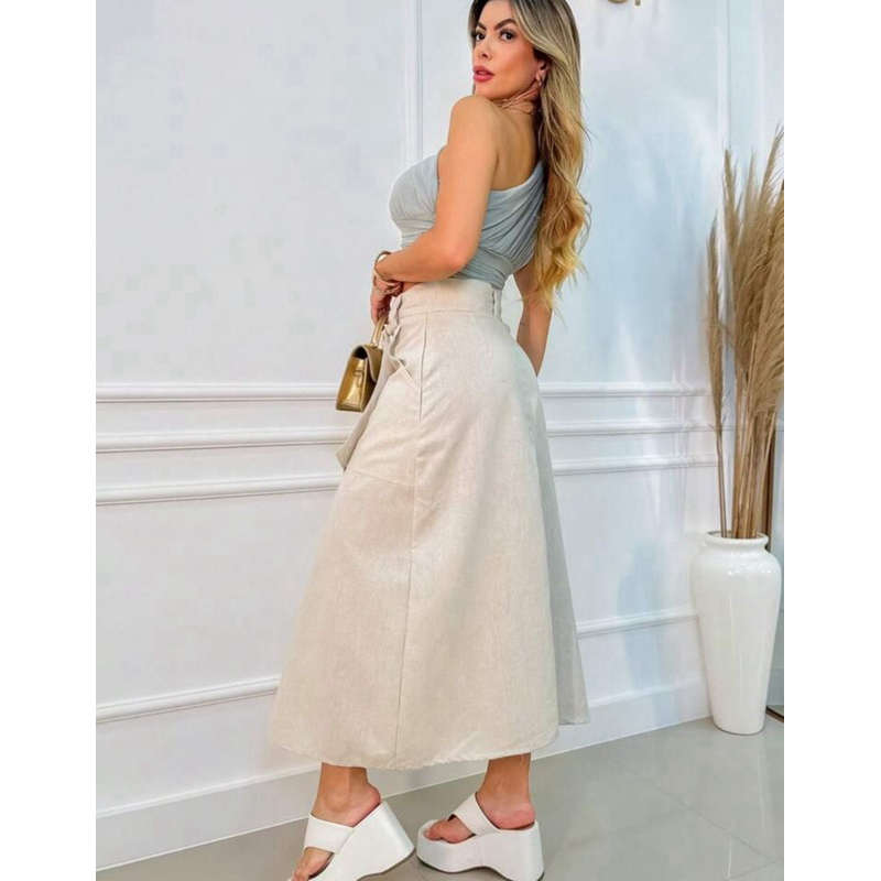 Saia Feminina Midi Linho Moda Evangélica Com Cinto no Material do Tecido Cintura Alta