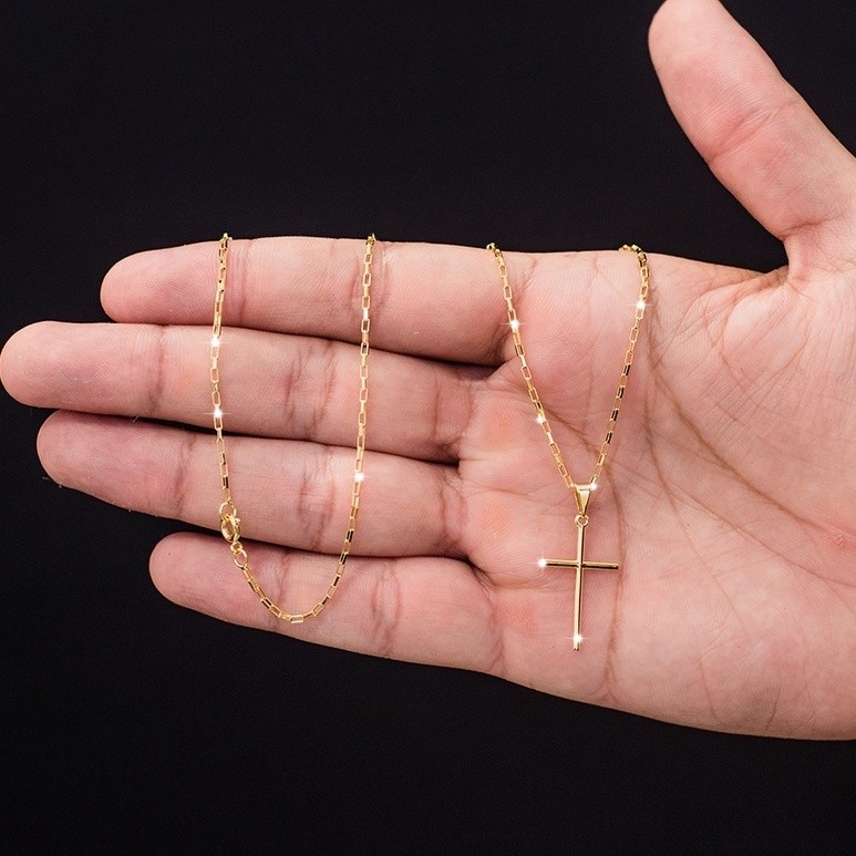 Colar masculino banhado a ouro 18k com corrente e pingente de cruz com uma cruz e moedas antigas.