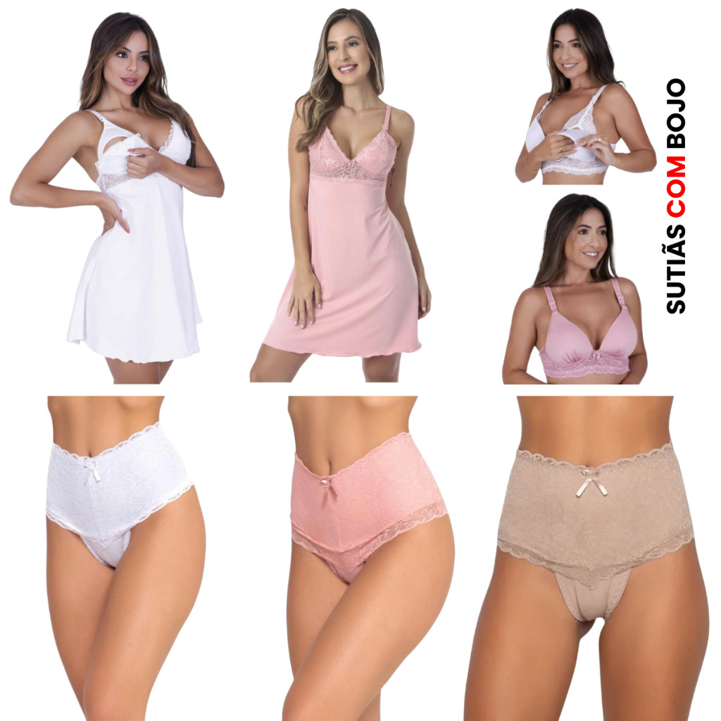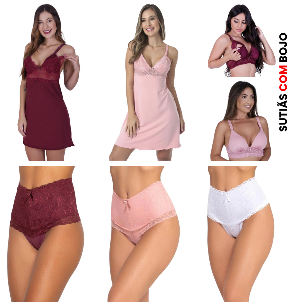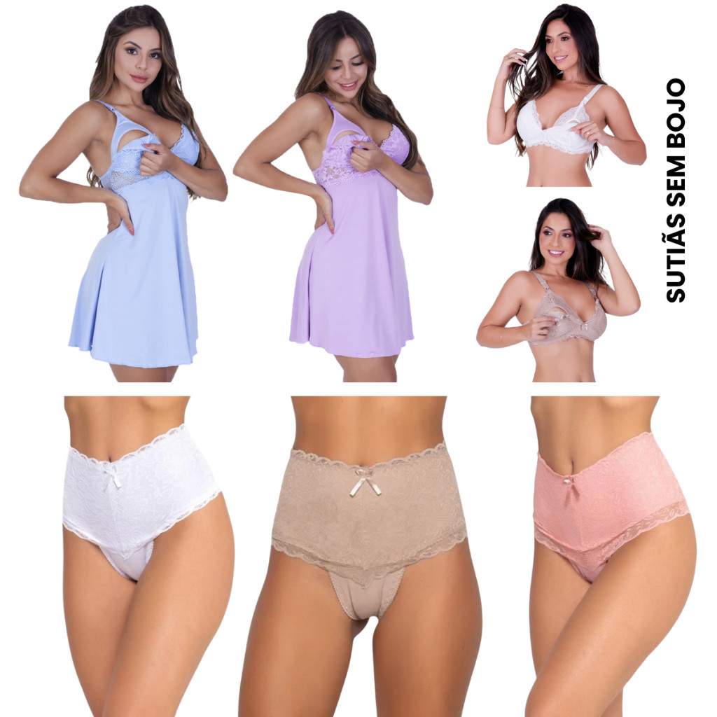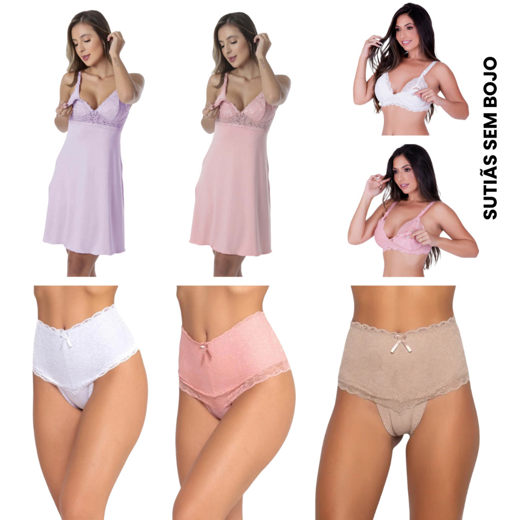 Kit Amamentação 2 Camisolas + 2 Sutiã Amamentação Com Bojo ou Sem Bojo + 3 Calcinha Pós Parto