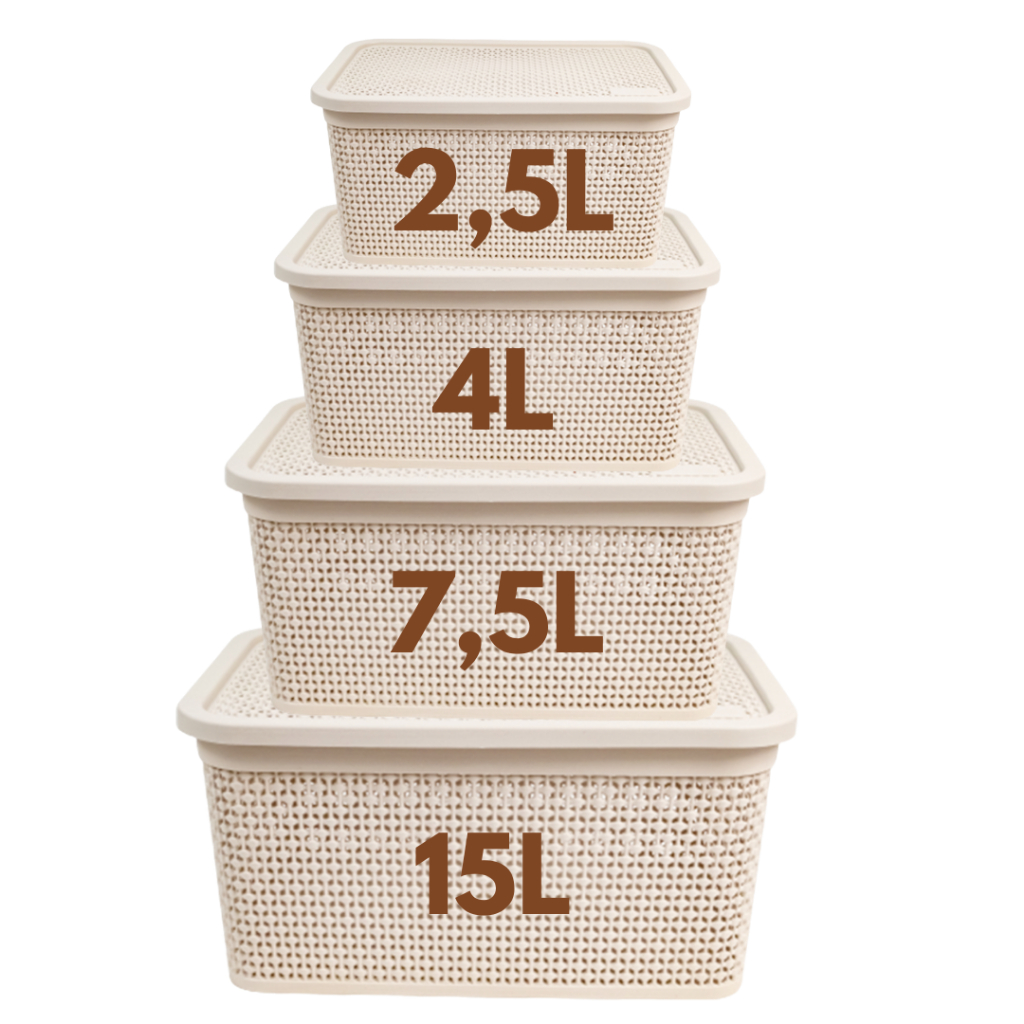 Kit 4 Caixas Organizadoras 15L, 7,5L, 4L, 2,5L com Tampa, Caixa Rattan Organizadora Com Tampa