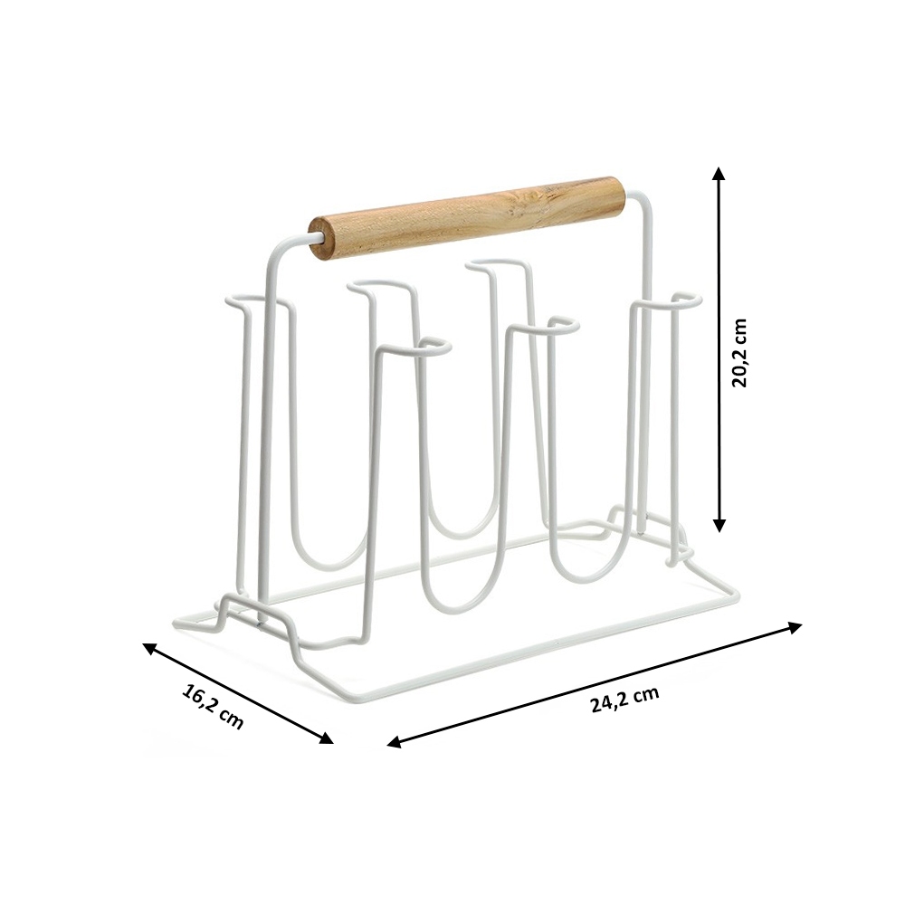 Porta 6 Copos Escorredor Suporte C/ Alça Bambu Metal Branco