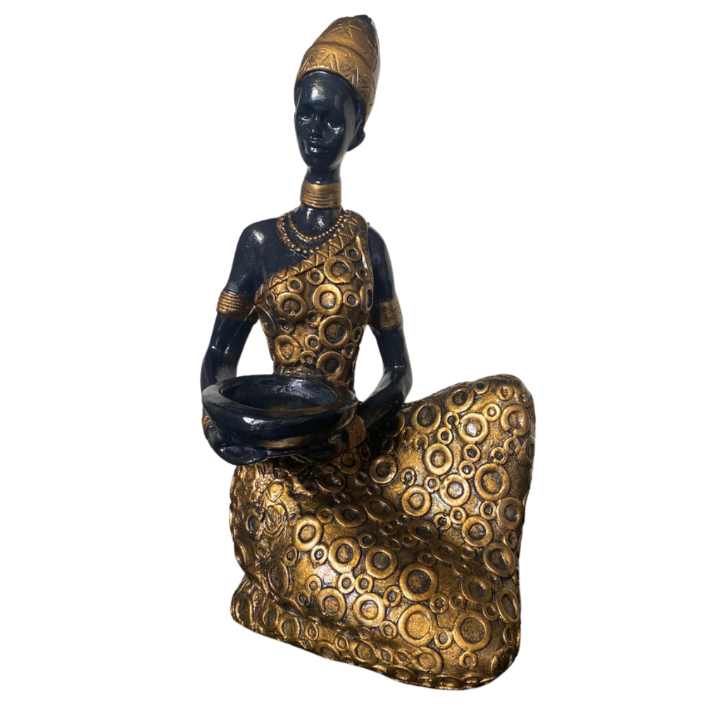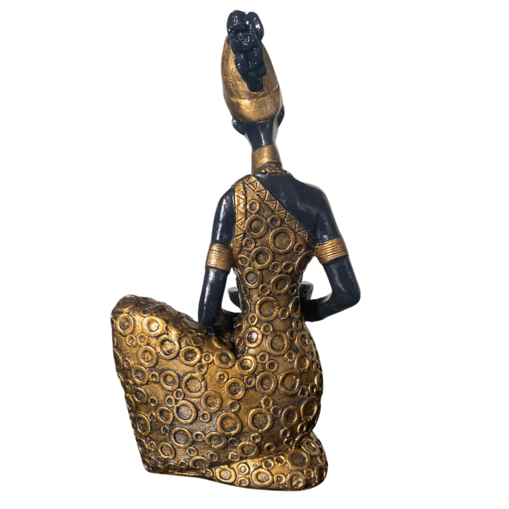 Escultura Africana Ajoelhada Artesanal Dourada com Preto Moderna Decoracao de casa