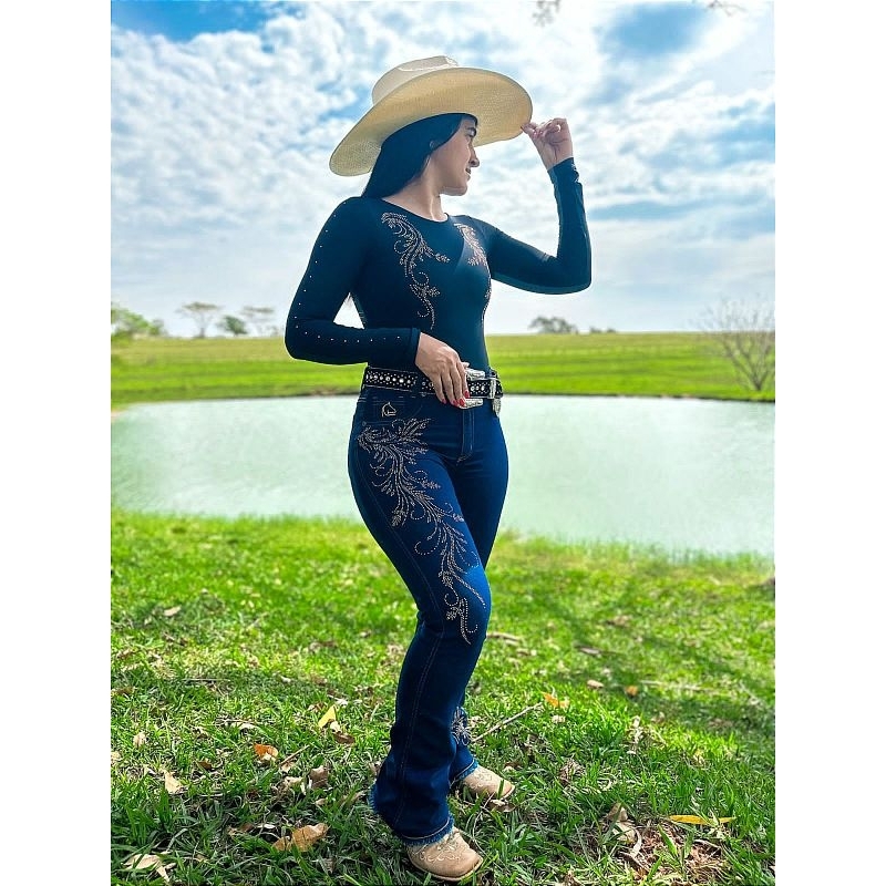 Calça Country Adulto e Infantil Blue Brilho Dourado Ramos em Pedraria