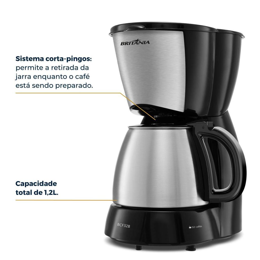 Cafeteira Britânia 32 Cafezinhos 1,2L BCF32B Jarra em Inox