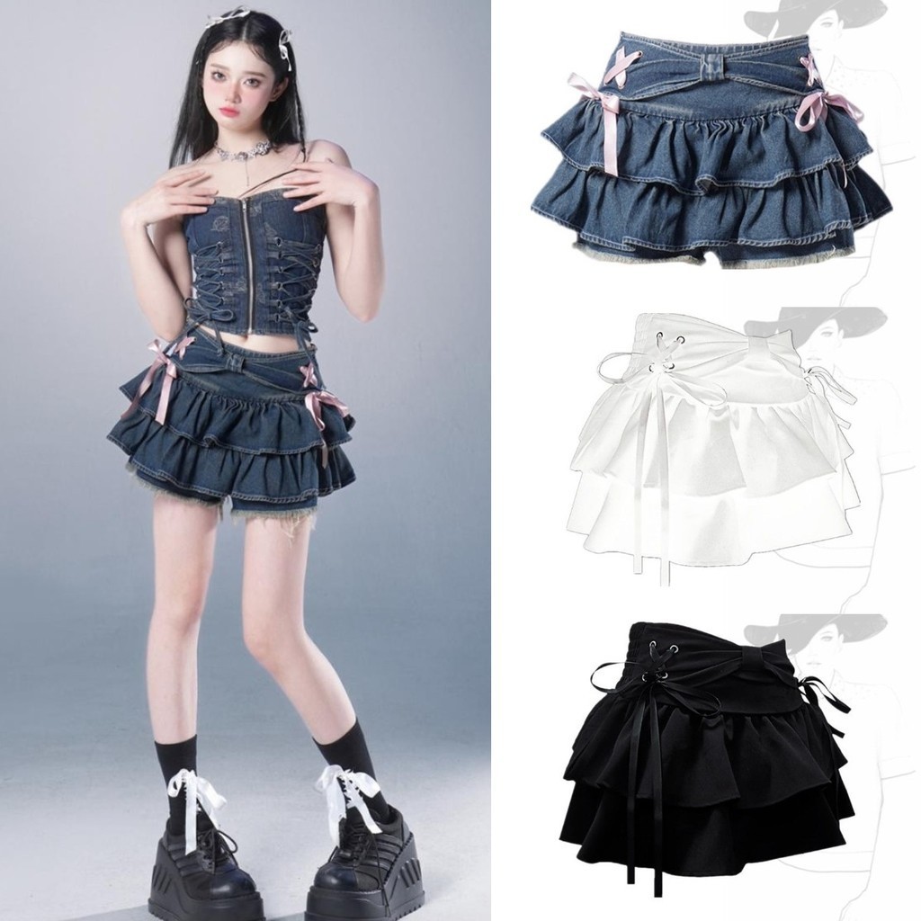 Saia Feminina Doll Blue Denim Pleated A-word Slim Design Curto