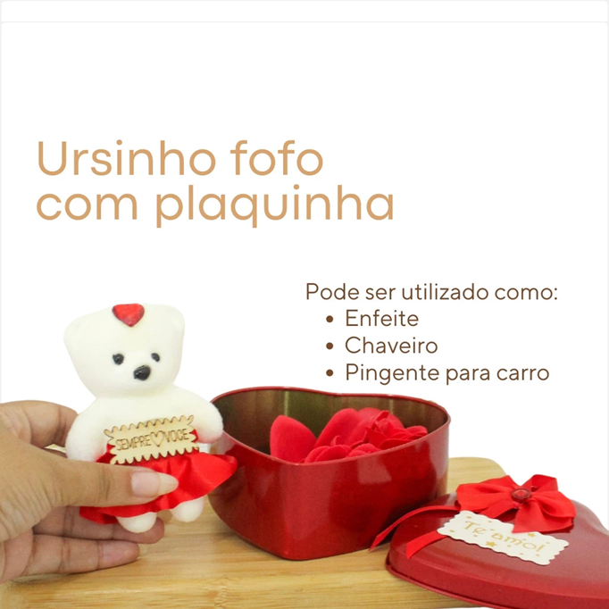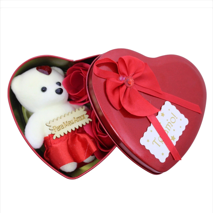 Caixa Coração de metal Com Ursinho e Rosas presente namorada esposa amiga mãe