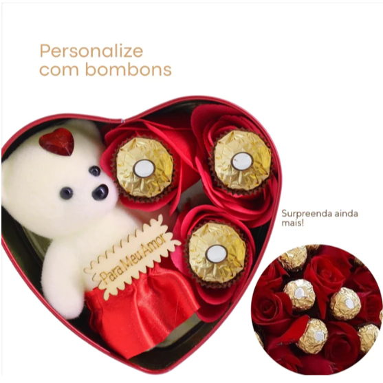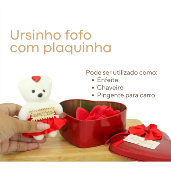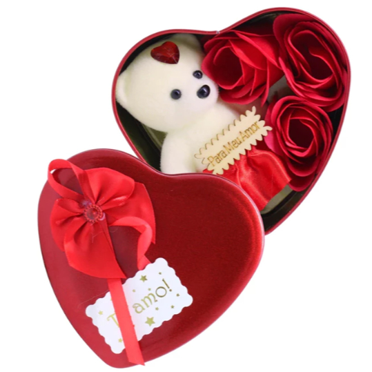 KIT 5 LATAS Caixa Coração de metal Com Ursinho e Rosas presente namorada esposa amiga mãe