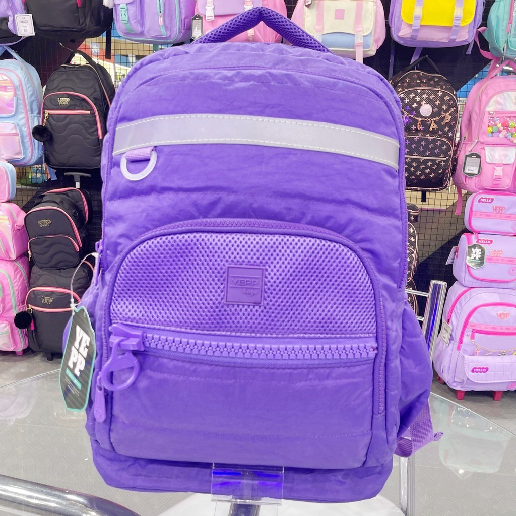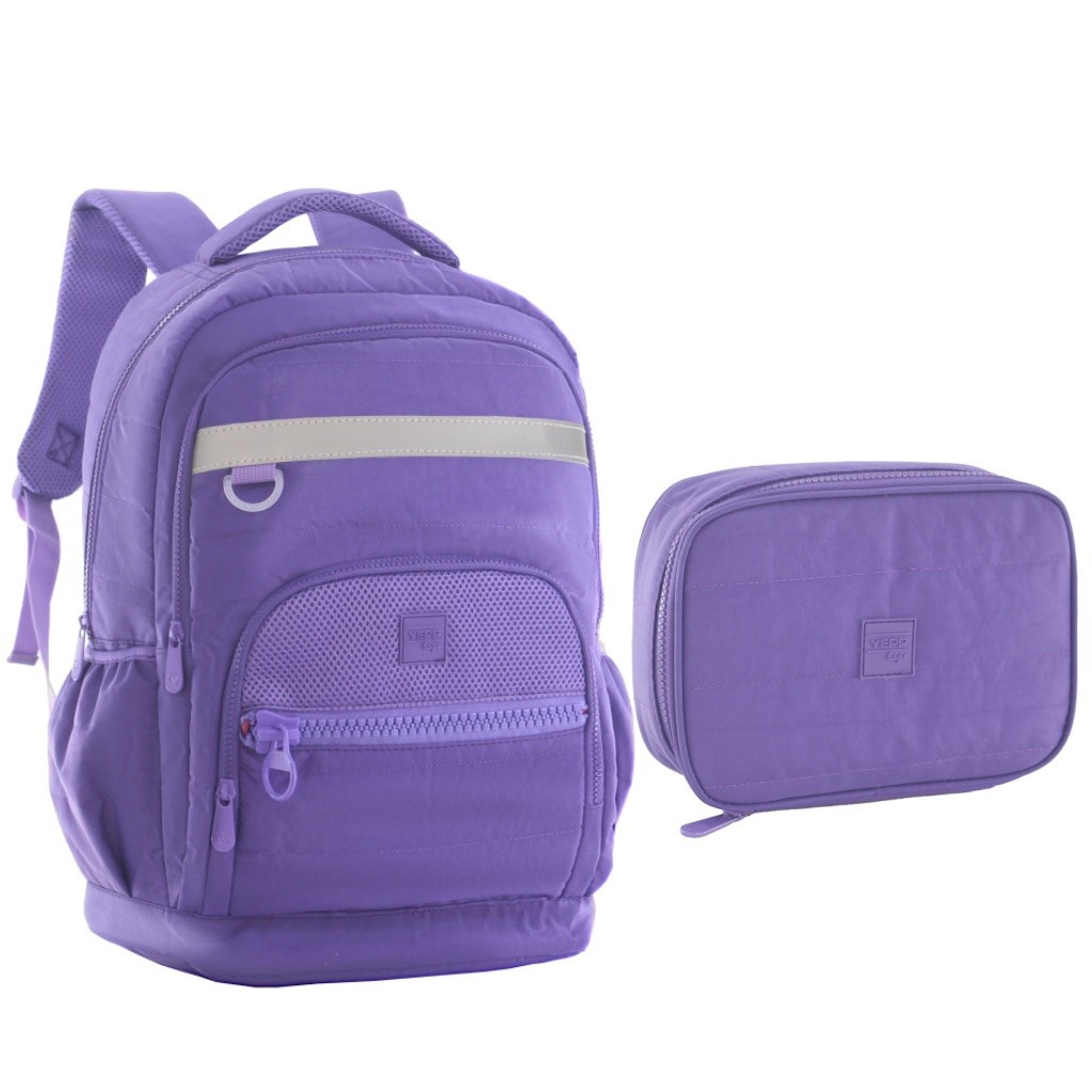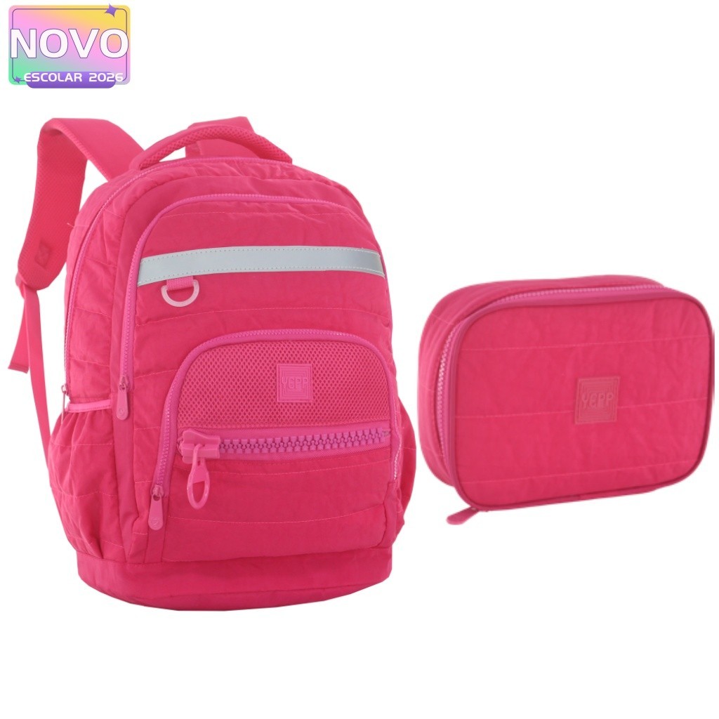 KIT de Mochila Grande Juvenil Estilosa Cor Pink Roxo Desenho do tecido Matelassê Lancheira Térmica e Estojo
